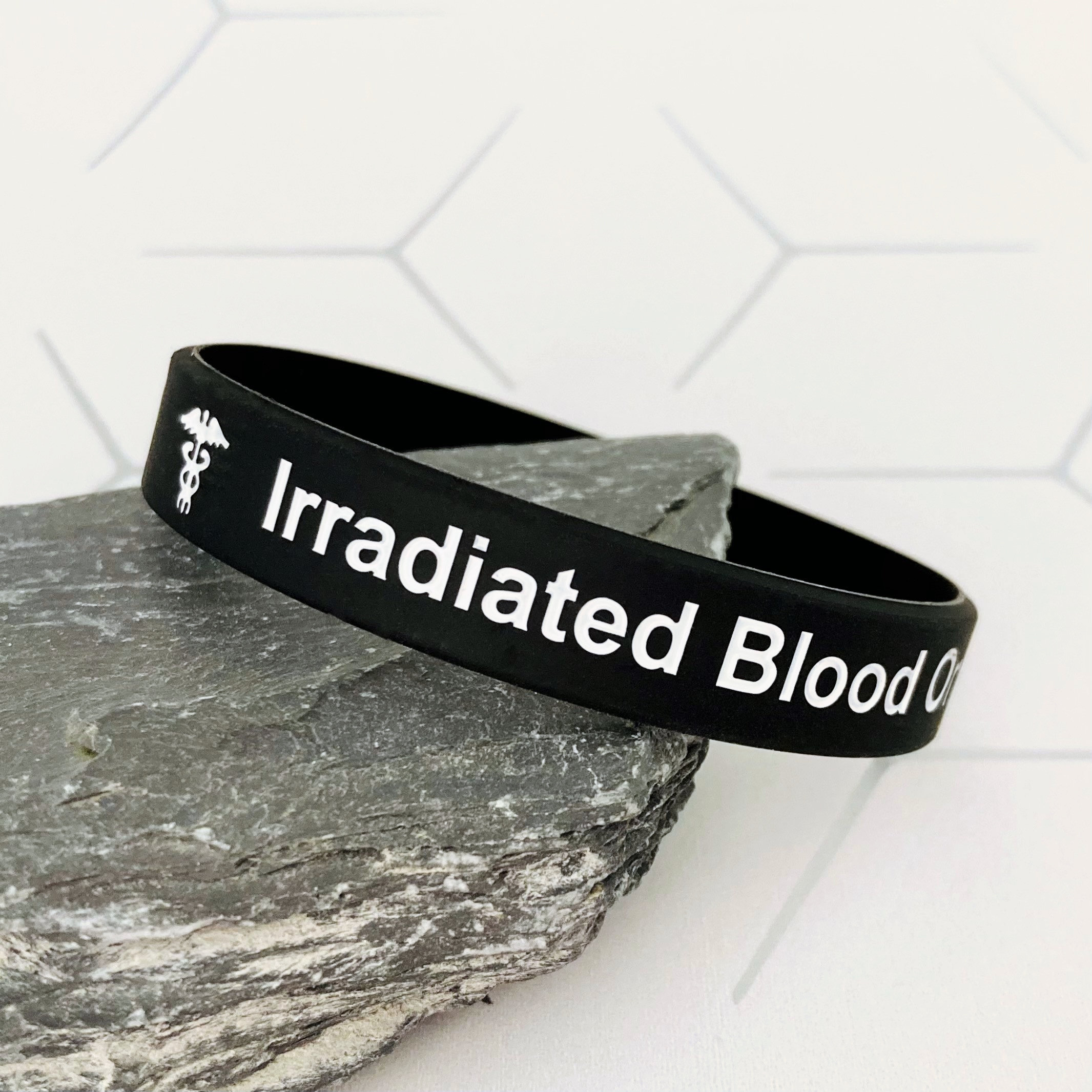 This irradiated blood medical bracelet features a black band with a white caduceus medical symbol an...