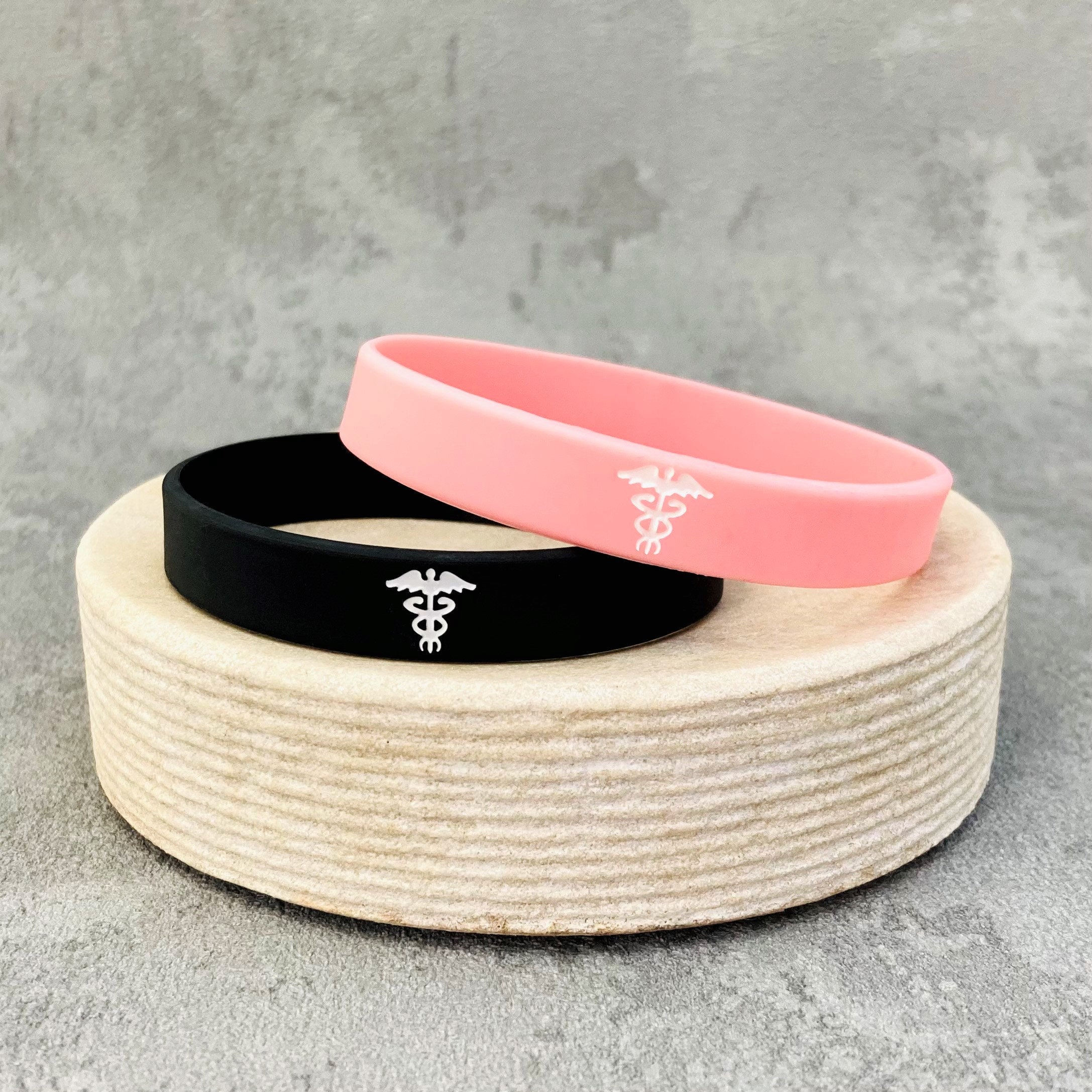 This hidden message medical wristband features a black or pink band with a white caduceus medical sy...