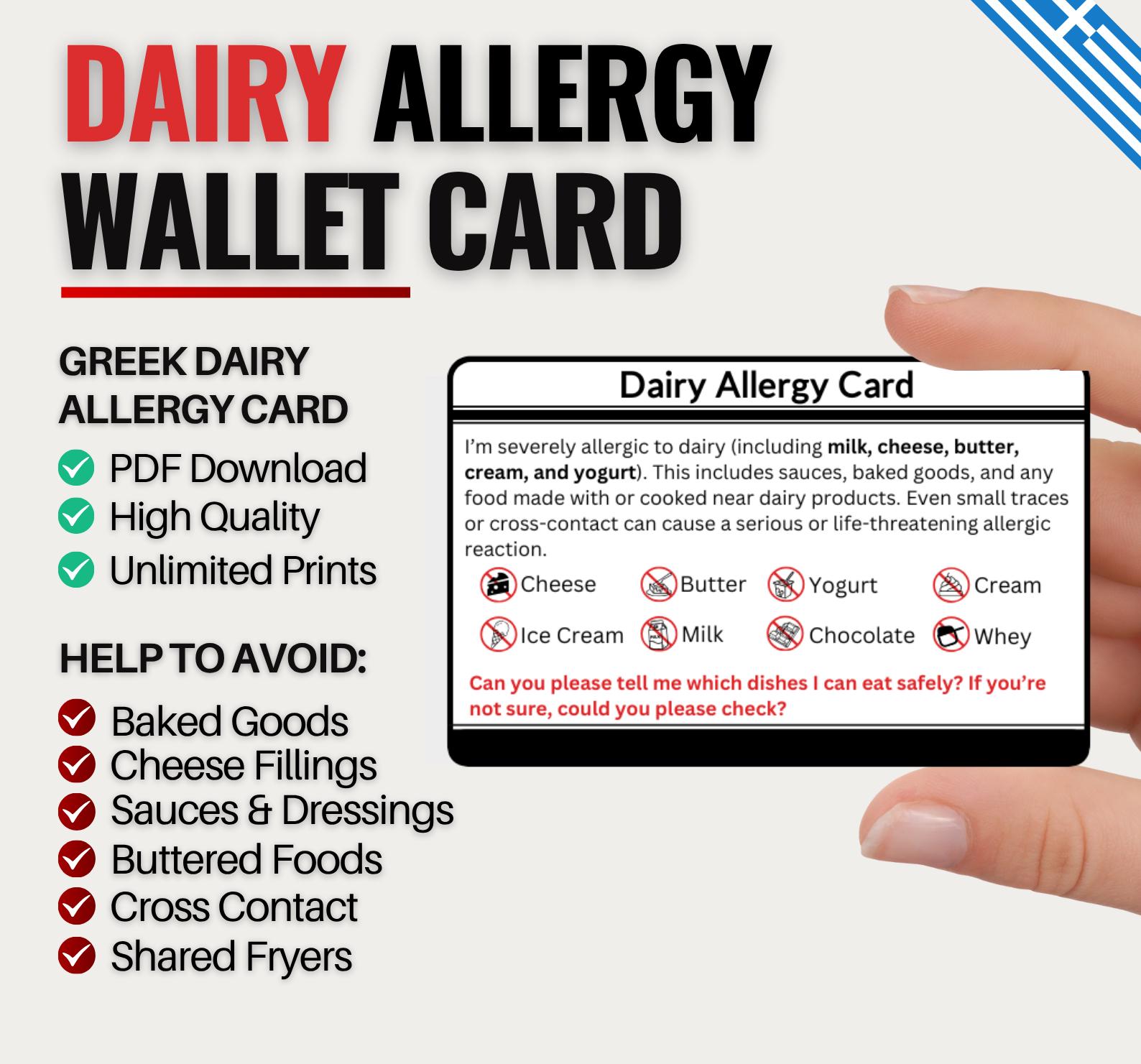 Dairy Allergy Travel Card in Greek | Milk Allergy Dining Card for G...
