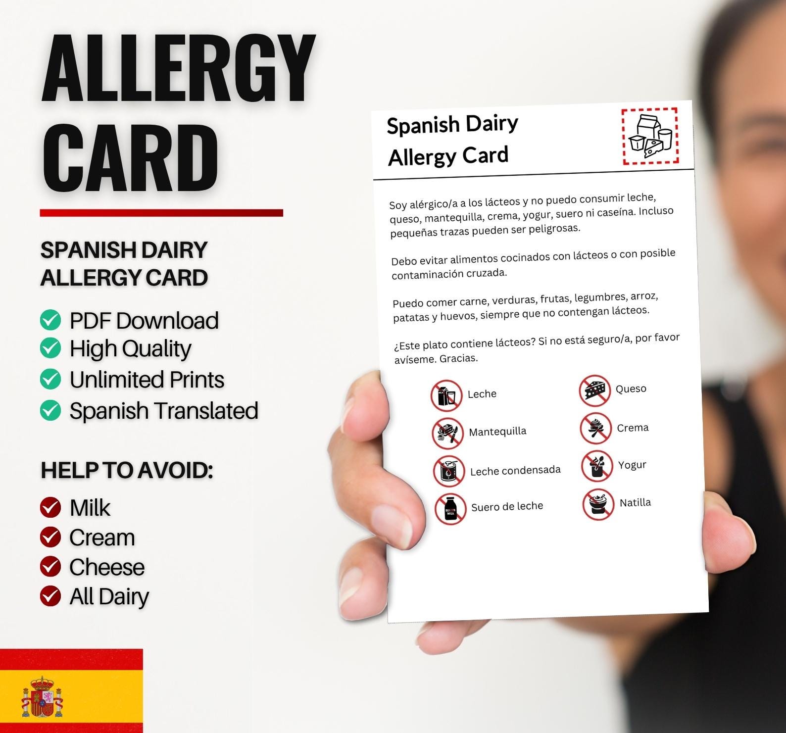 Spanish Dairy Allergy Card for Travel & Restaurants | Milk and ...