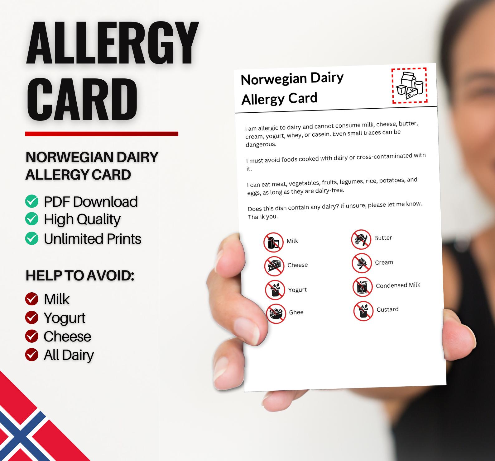 Norwegian Dairy Allergy Card for Travel and Restaurants | Milk &...