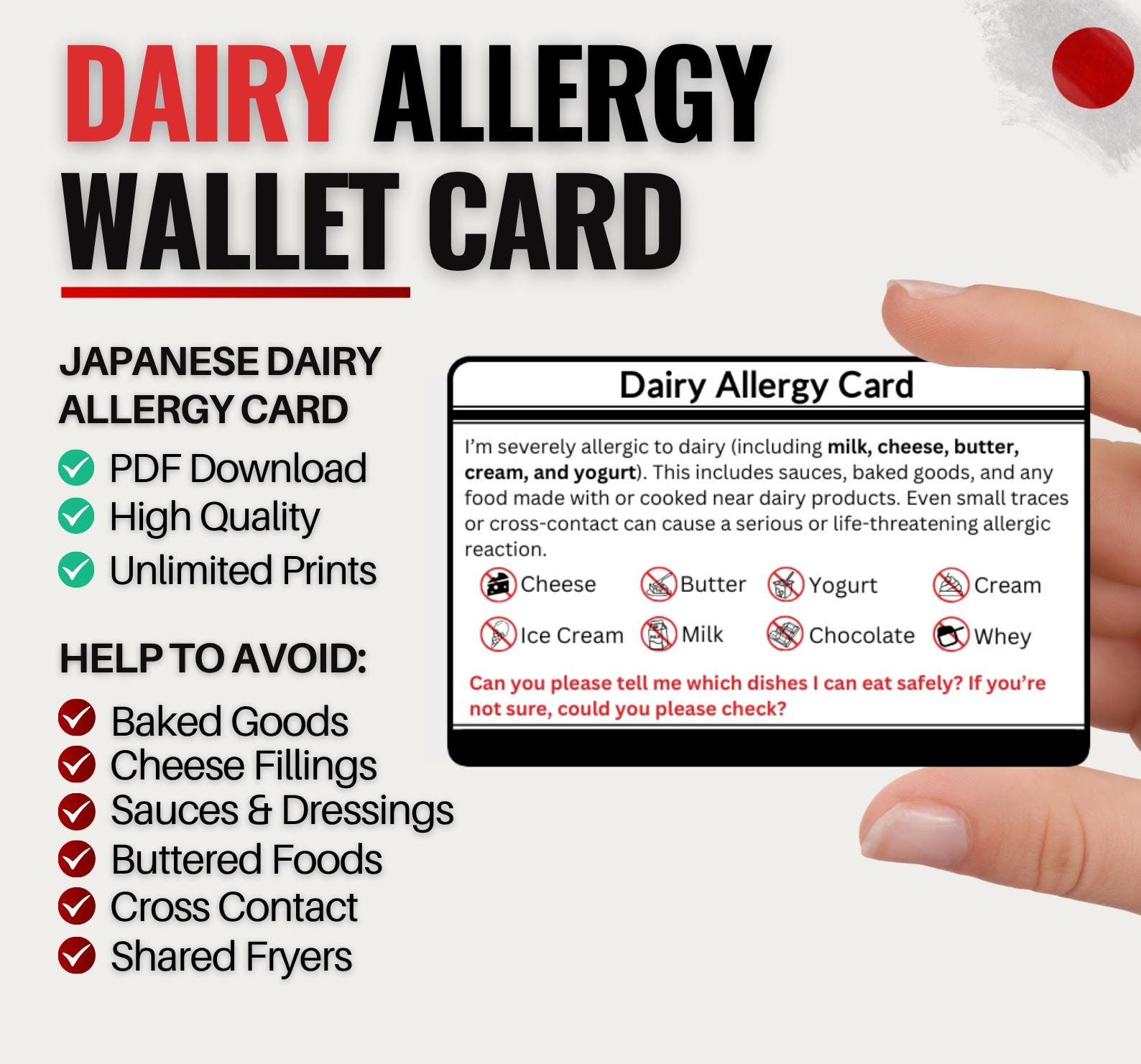 Dairy Allergy Travel Card in Japanese | Milk Allergy Card for Resta...