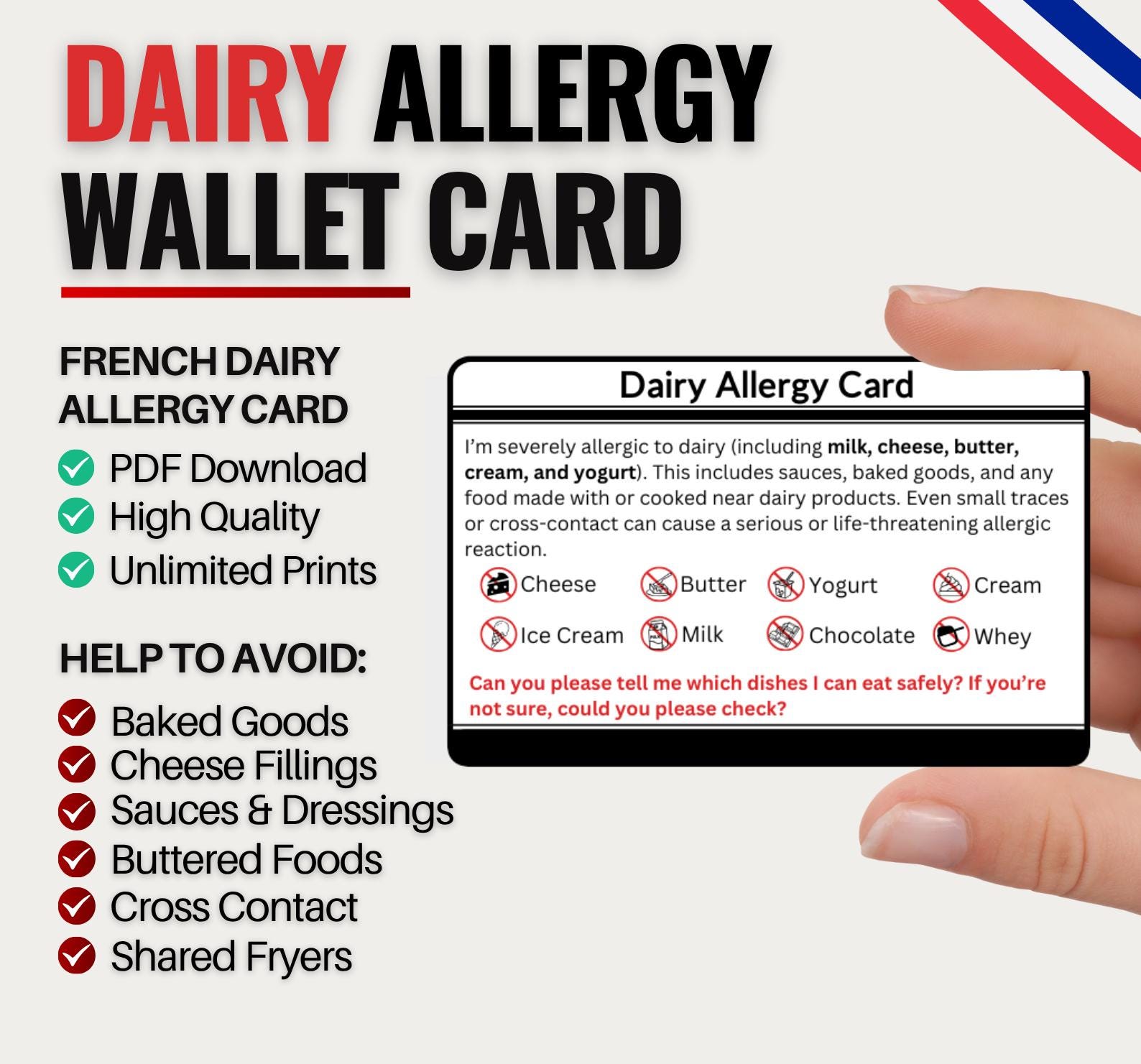Traveling to France with a dairy allergy? This French Dairy Allergy Card is designed to help you din...