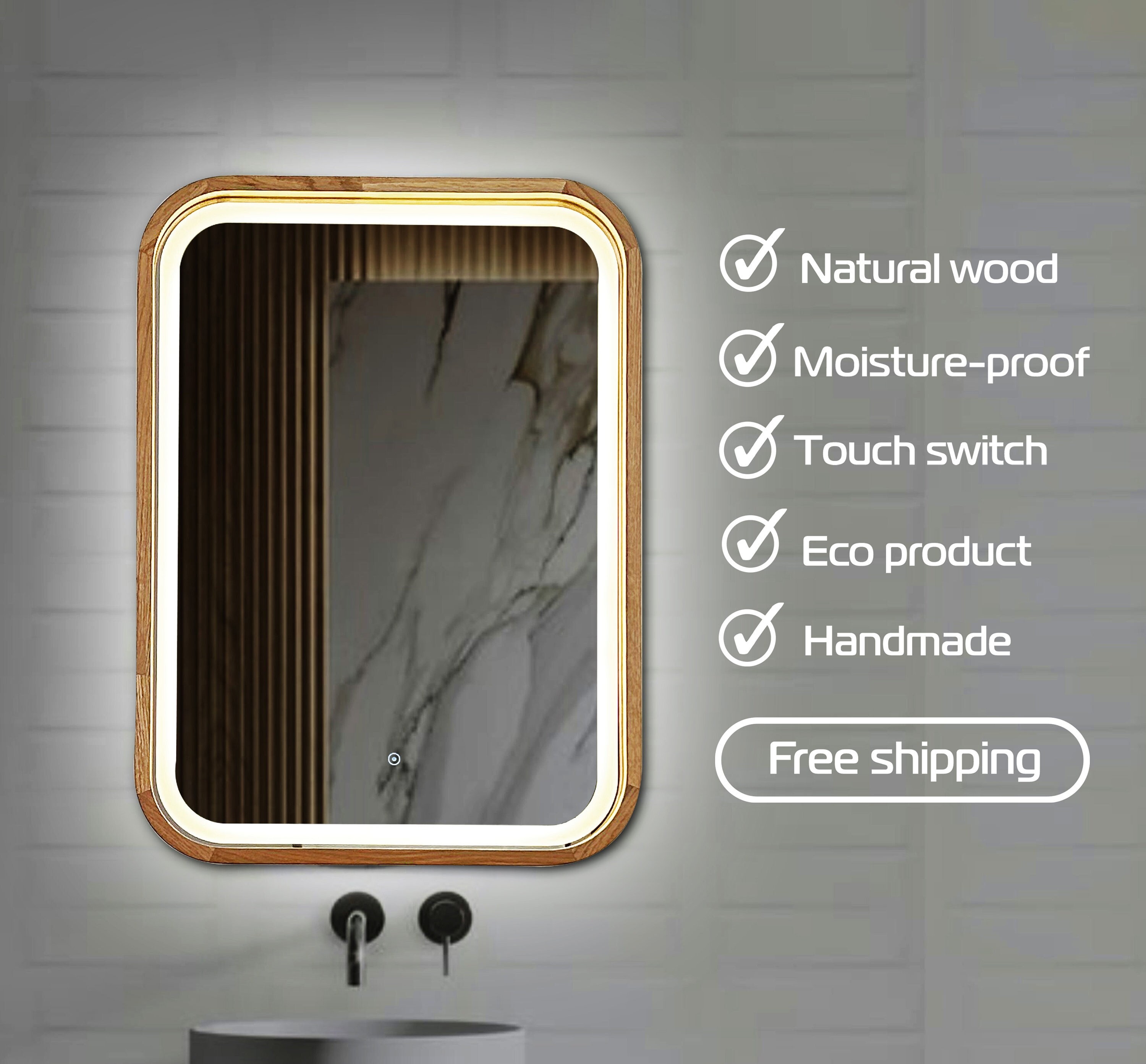 Rectangular wood mirror, LED lighting mirror, Wooden wall mirror, L...