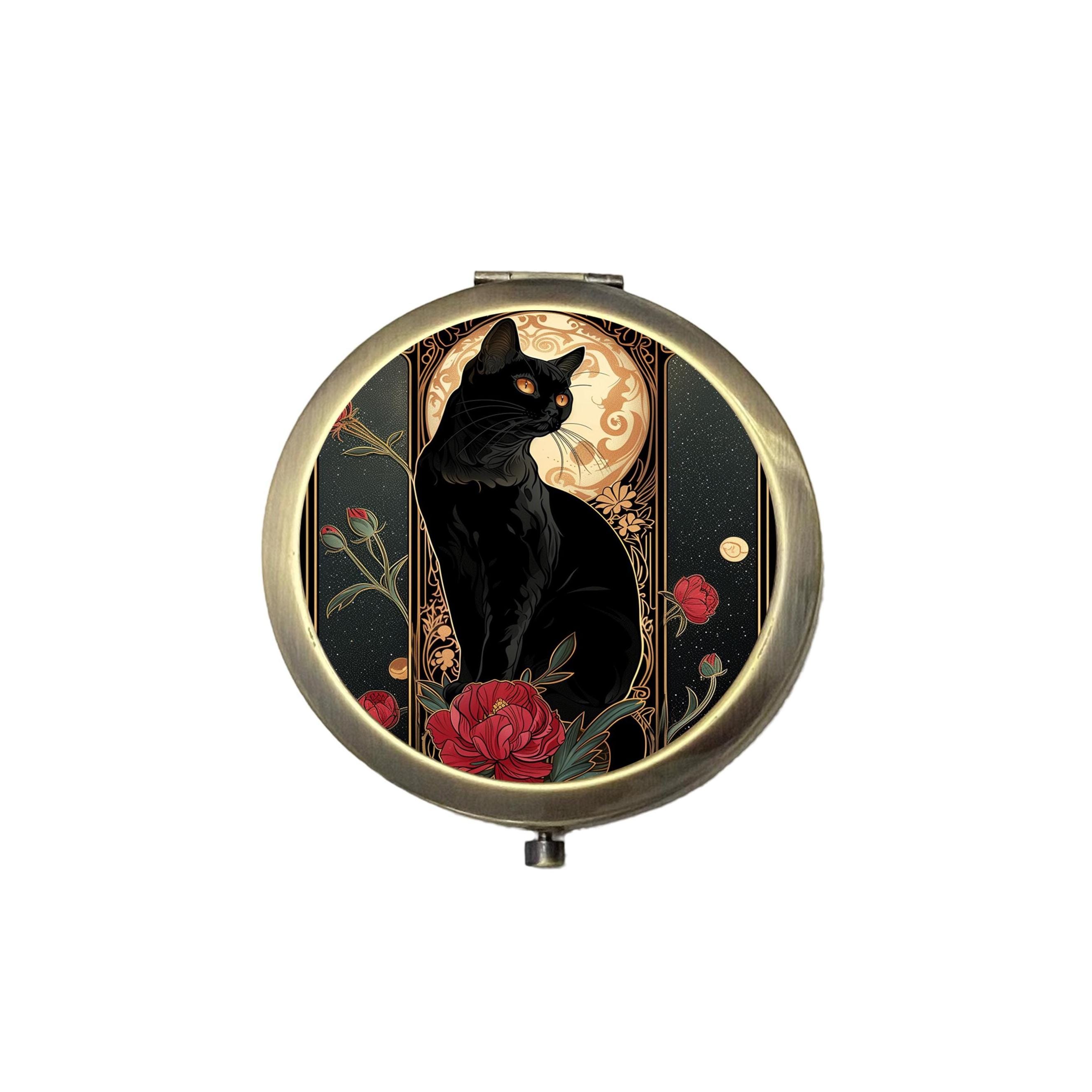 Black Cat Compact Mirror Art Deco Gothic Style Floral Red Peonies P...