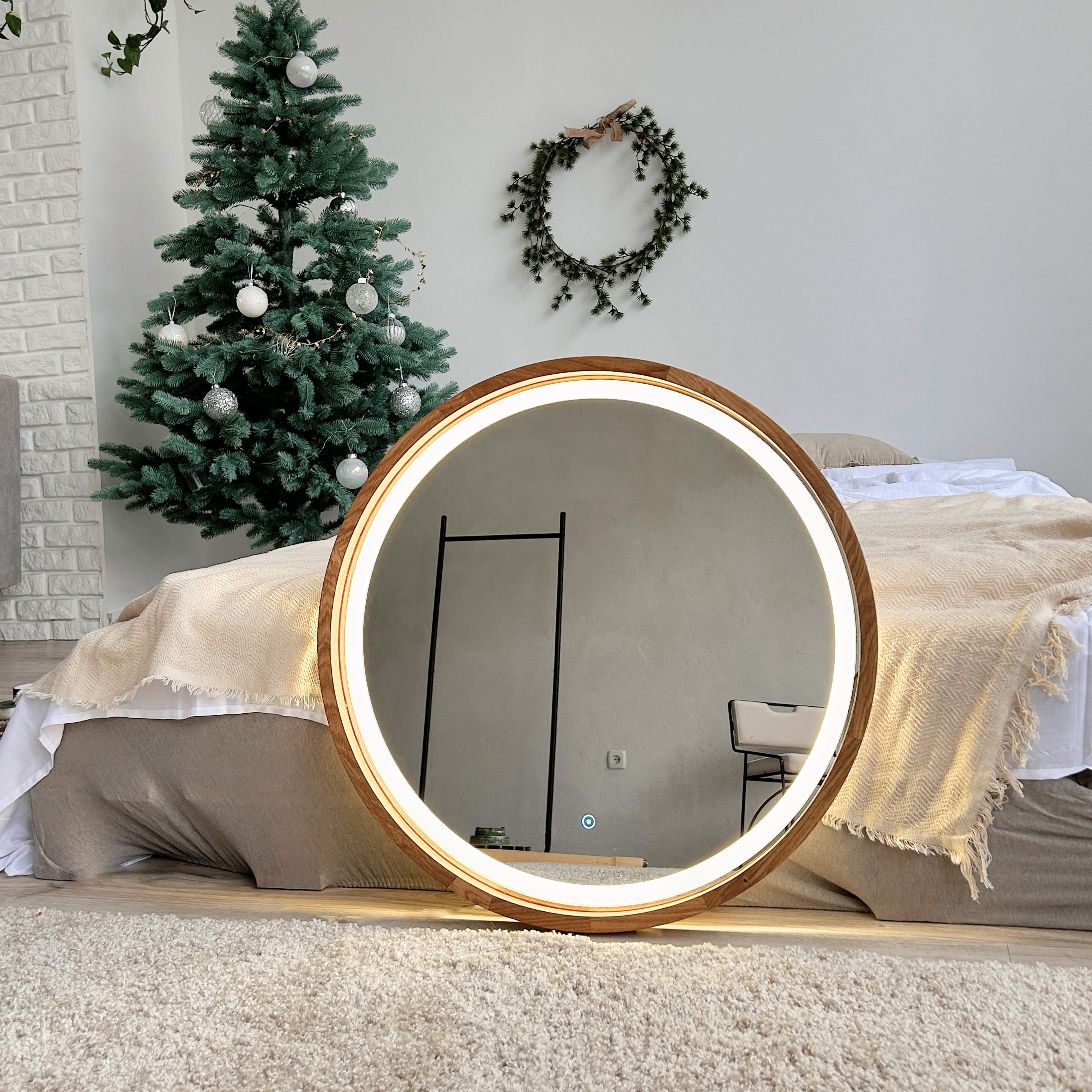 Round LED mirror, Wood mirror, LED Light, Bathroom mirror, Makeup m...