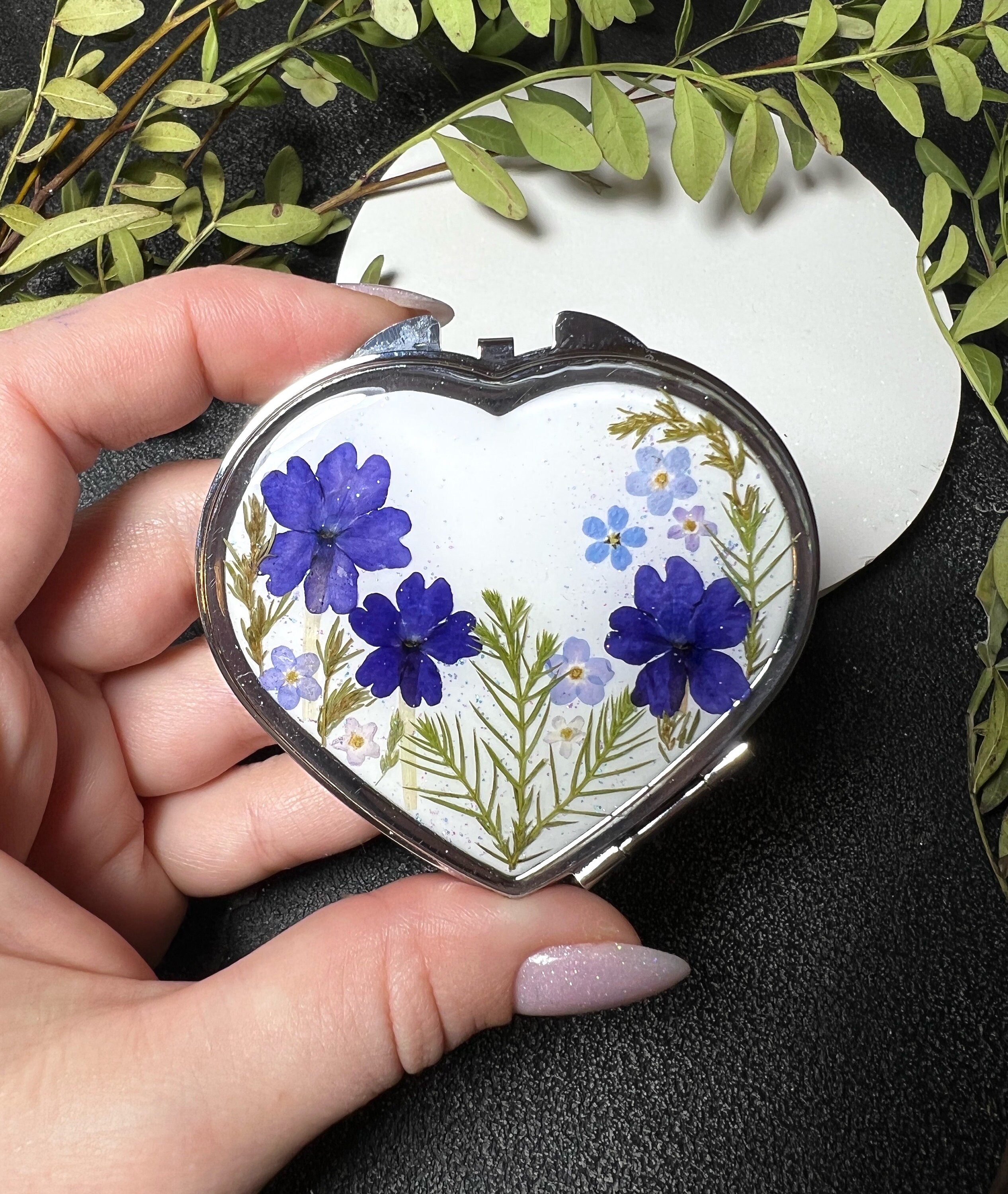 Handmade pocket mirror with real pressed dried flowers. I use only real flowers. Each FLOWER IS UNIQ...