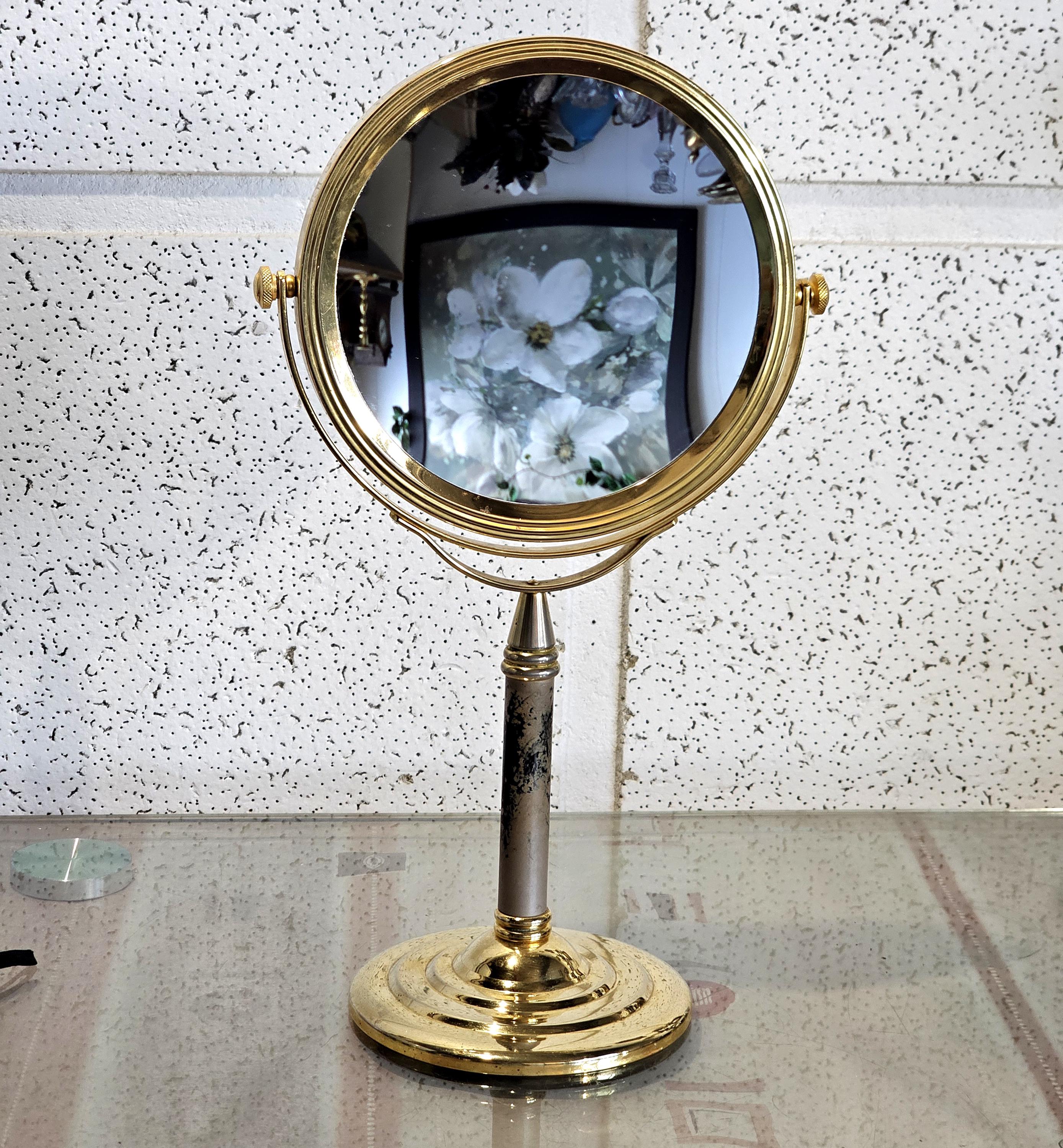 double-sided standing mirror in gold metal, round swivel mirror, vintage metal table mirror on stand...