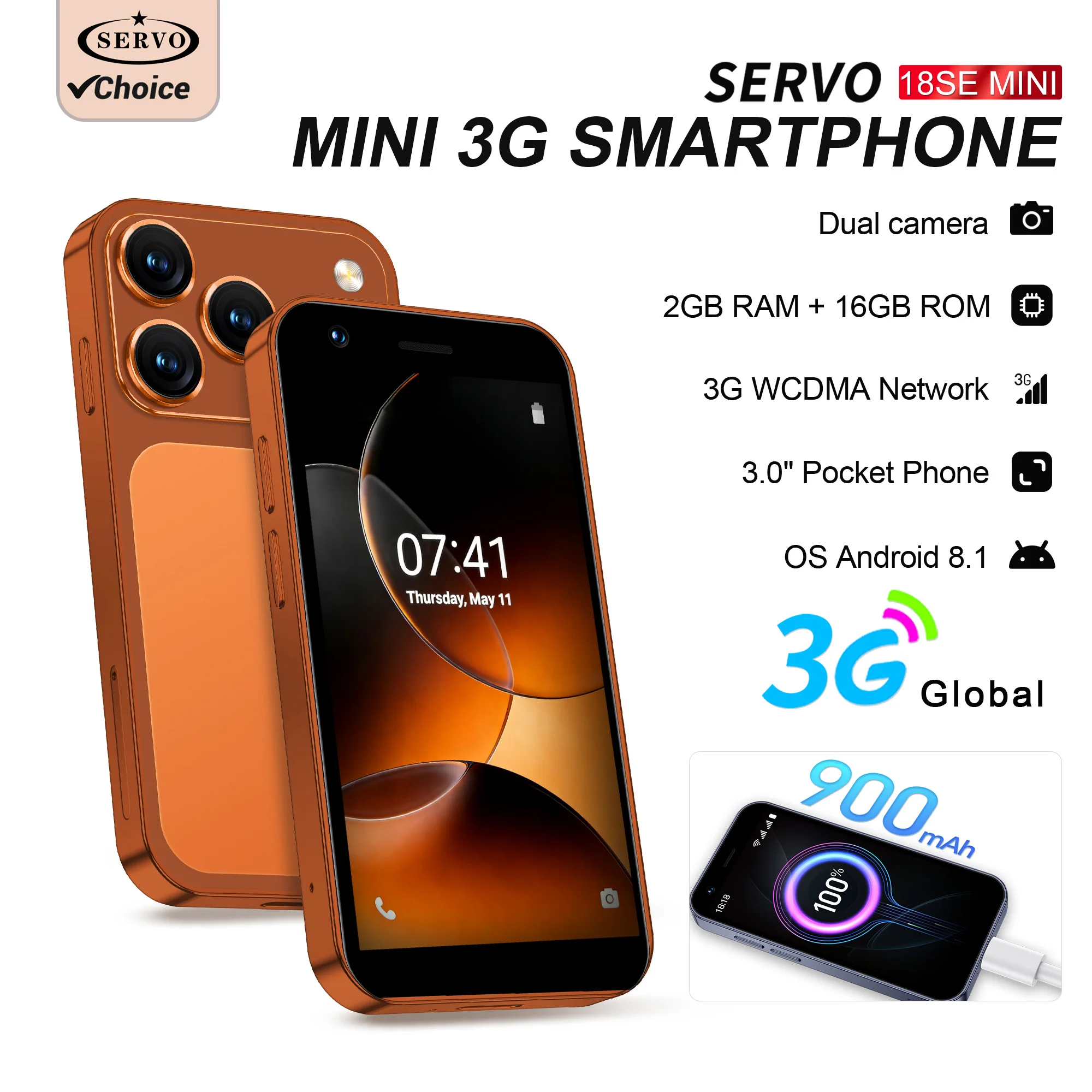 SERVO 18SE Mini Smartphone Android OS 3.0" Fullview Display 3G Cellular 2GB+16GB Face Unlock Sm...