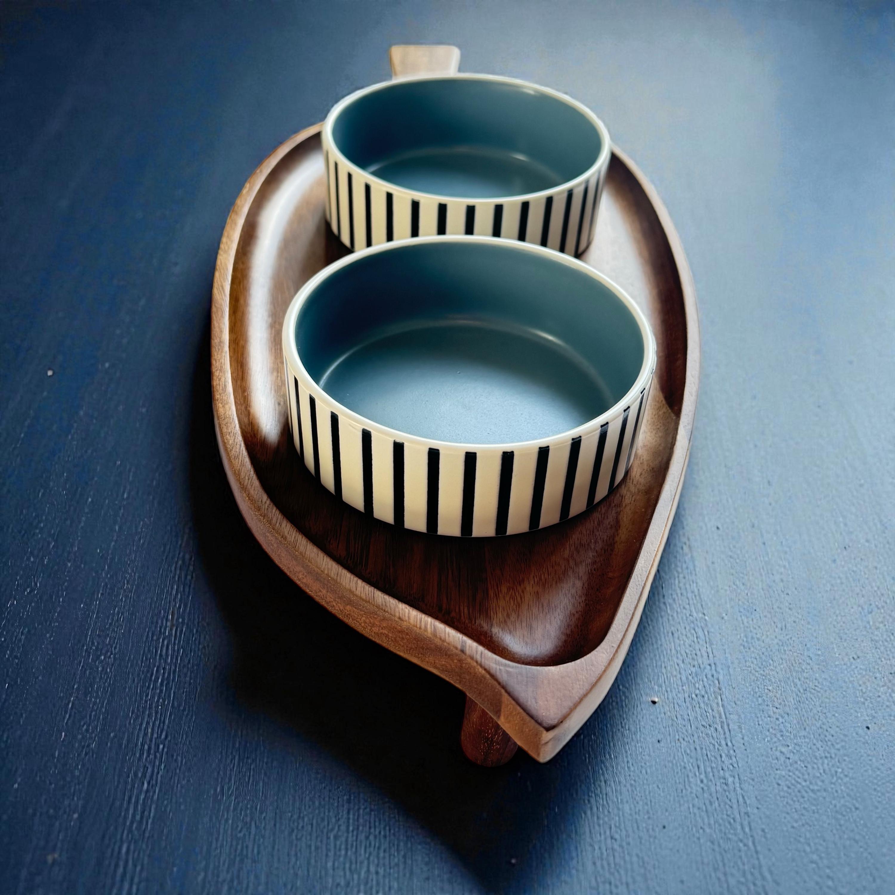 Handmade Acacia Wood Raised Pet Feeder with Ceramic Bowls cat bowls...