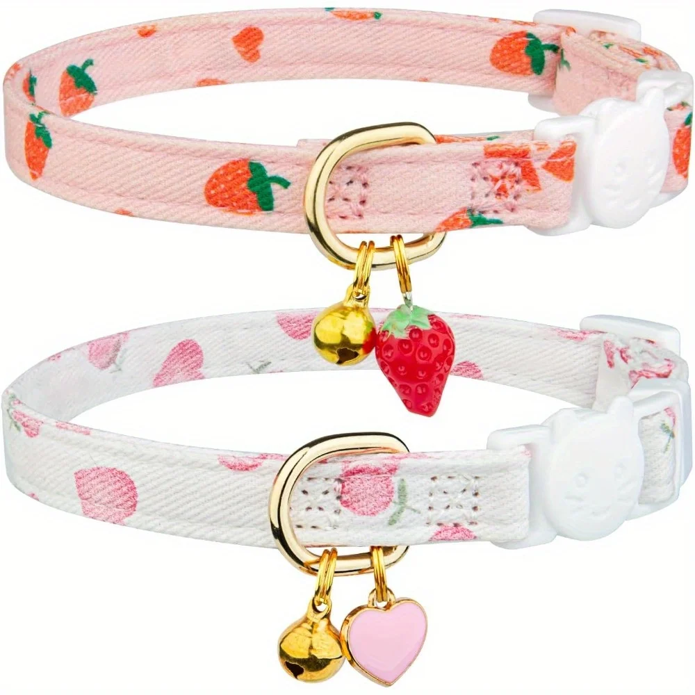2 Pack Cotton Breakaway Cat Collar Pink Strawberries and White Heart Shaped Pendant Cute Kitten Cat ...