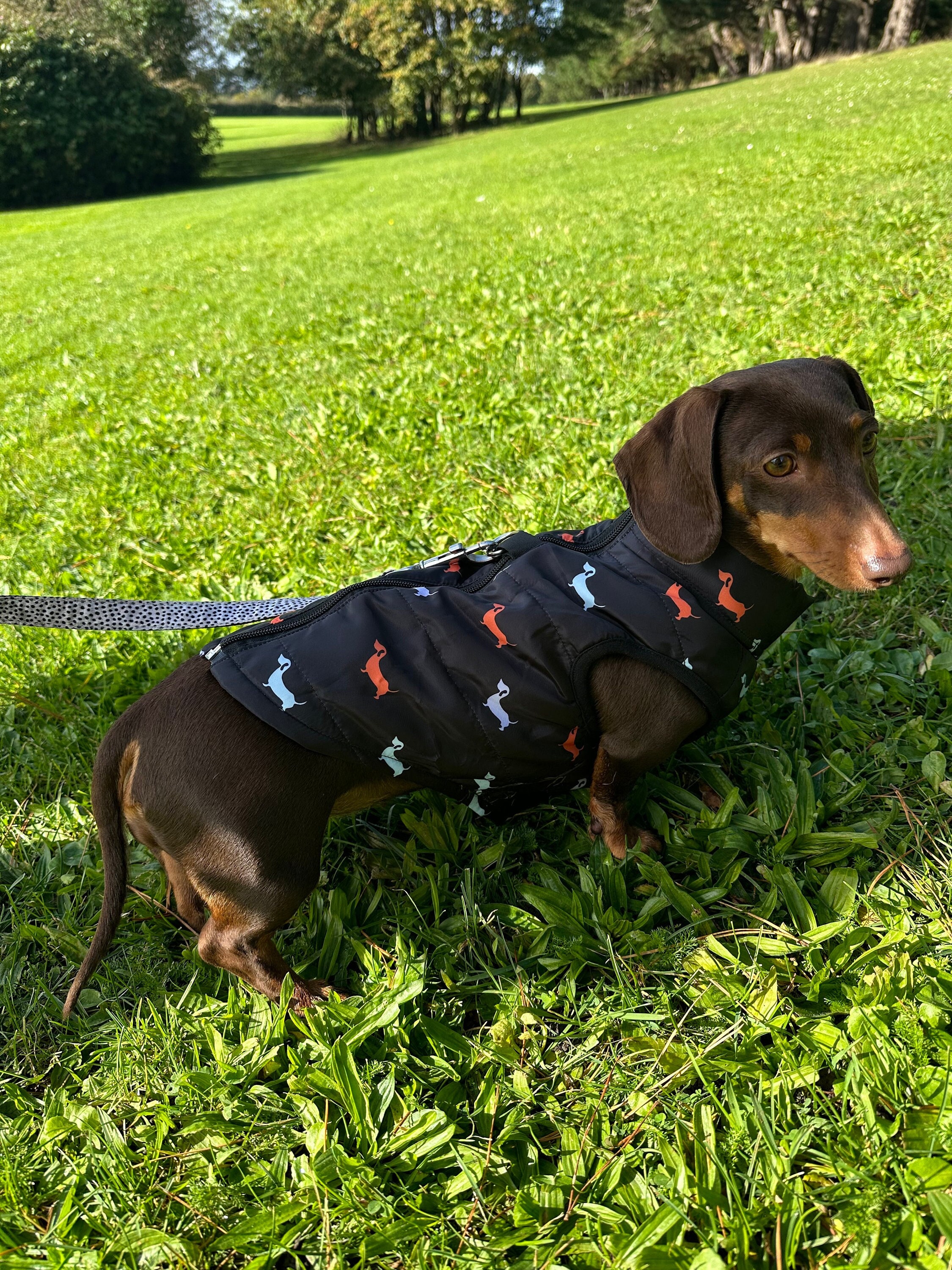 Keep your pup cozy, stylish, and secure on every walk with this adorable Dachshund Print Dog Jacket ...