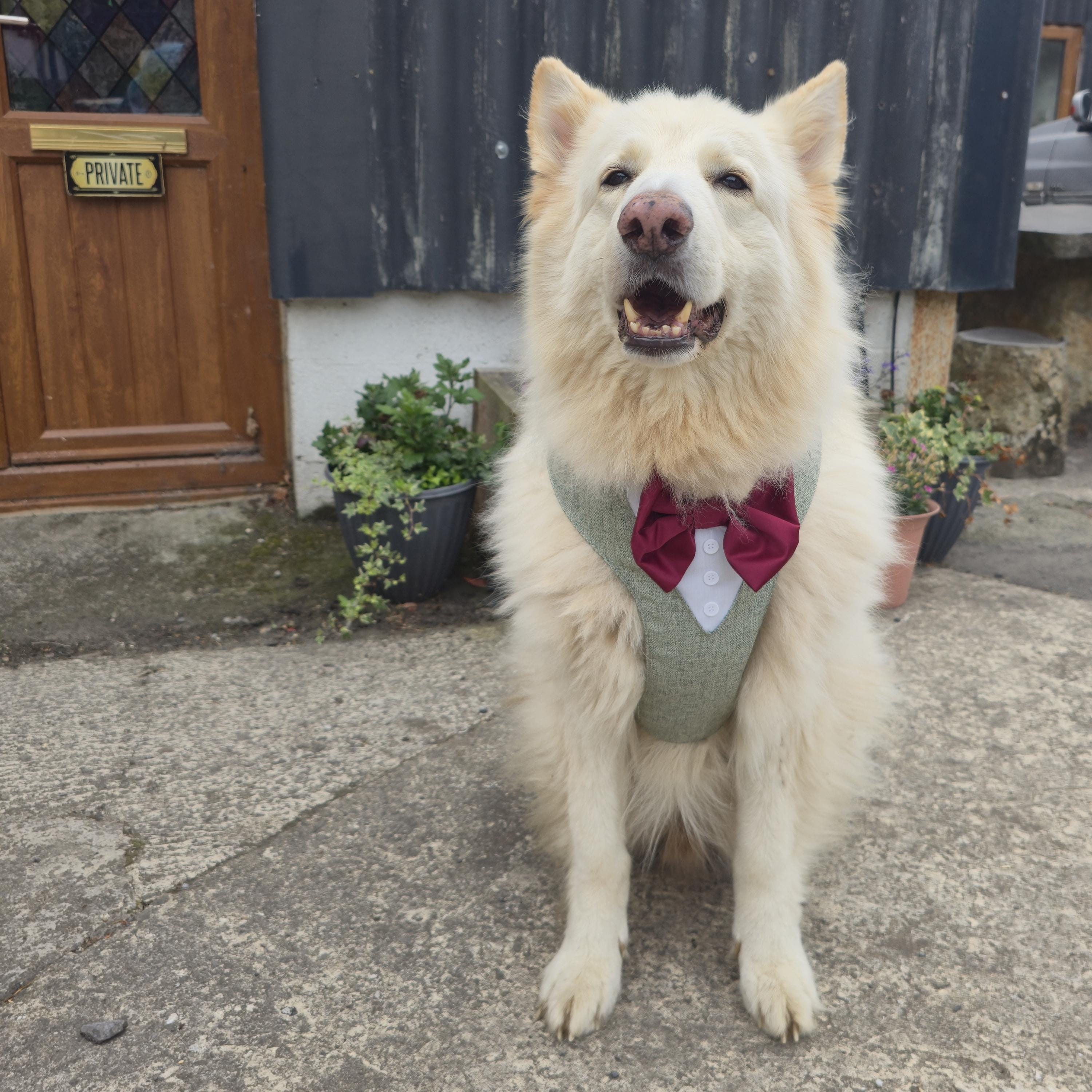 • Sage Green Tweed Tuxedo Wedding Dog Harness in Light Sage Moss Gree...