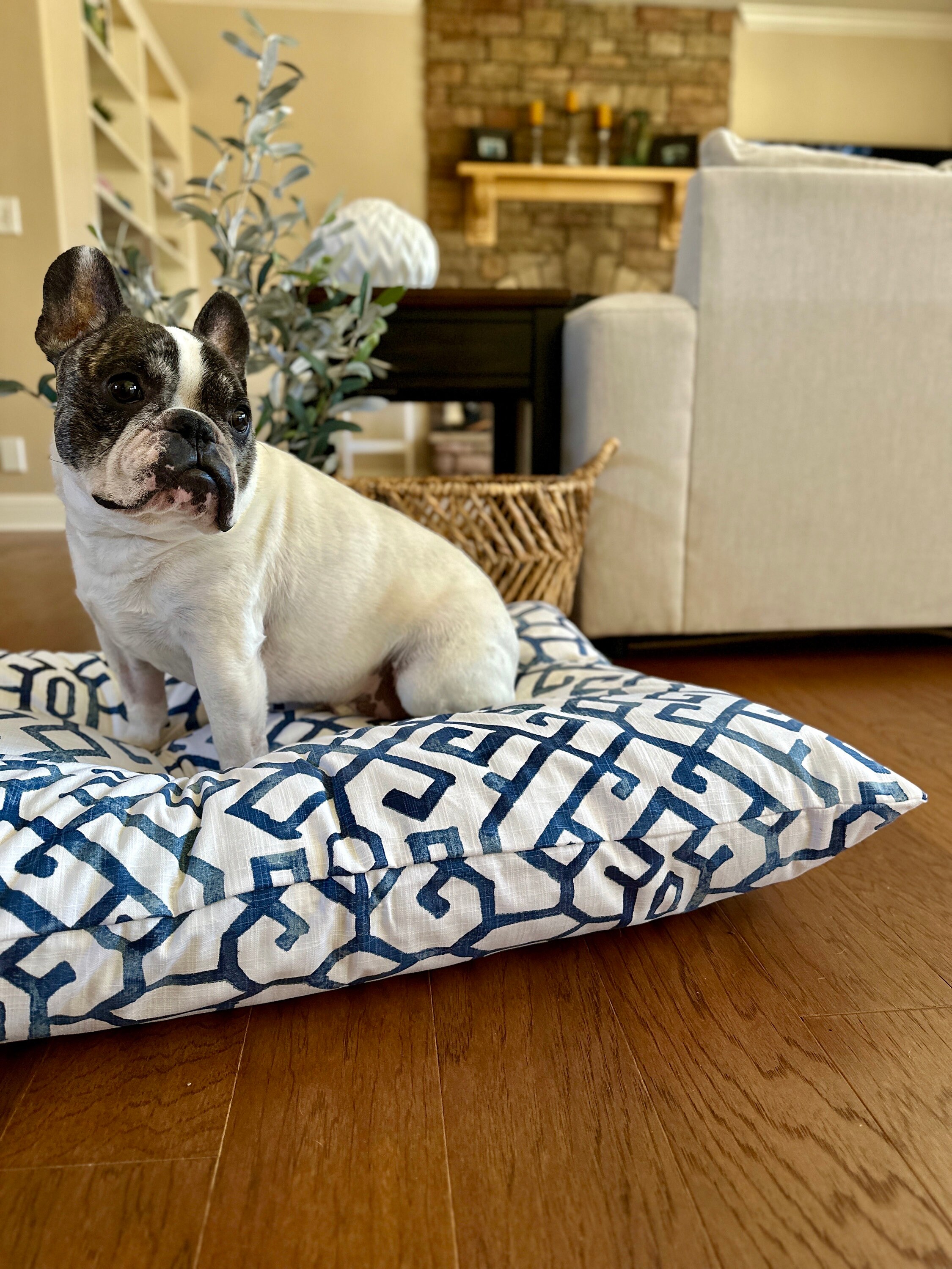 "This elegant Blue and white dog bed cover is made from luxury upholstery grade fabric like you...