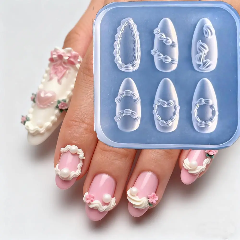 1pc French Cake Cream Nail Carving Mold Goth Cake Edge Cream Stripe Heart Nail Mold DIY Reusable Sil...