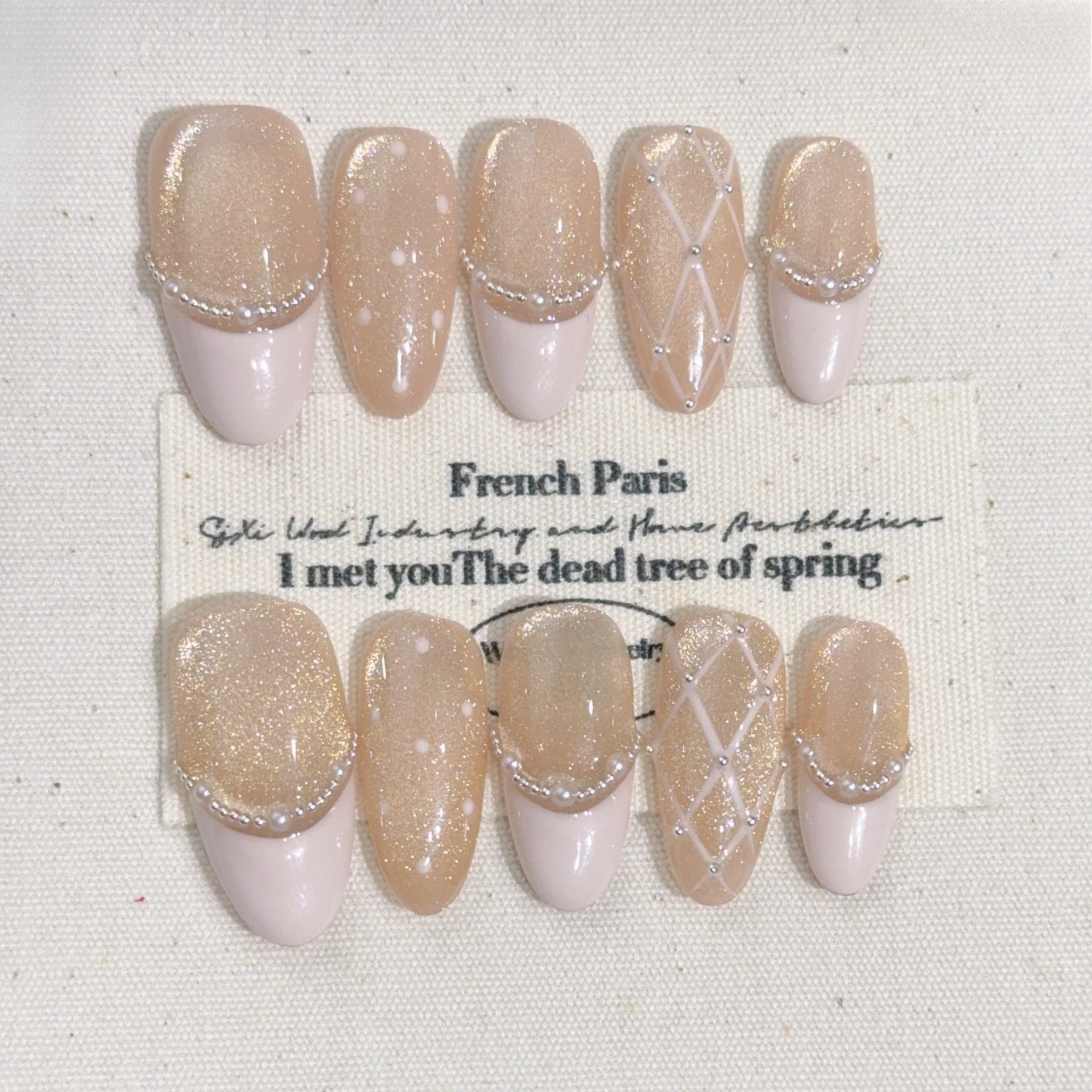 10pcs Creme French Fake Nails Pink Glitter Cat Eye False Nails Oval Press on Nails Cute Plaid Pearl ...