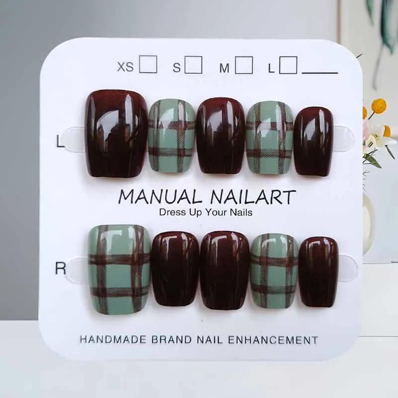 10Pcs Autumn and Winter High End Brown Green Plaid Nail Patch Simple Women and Girls Ins Nail Slices...