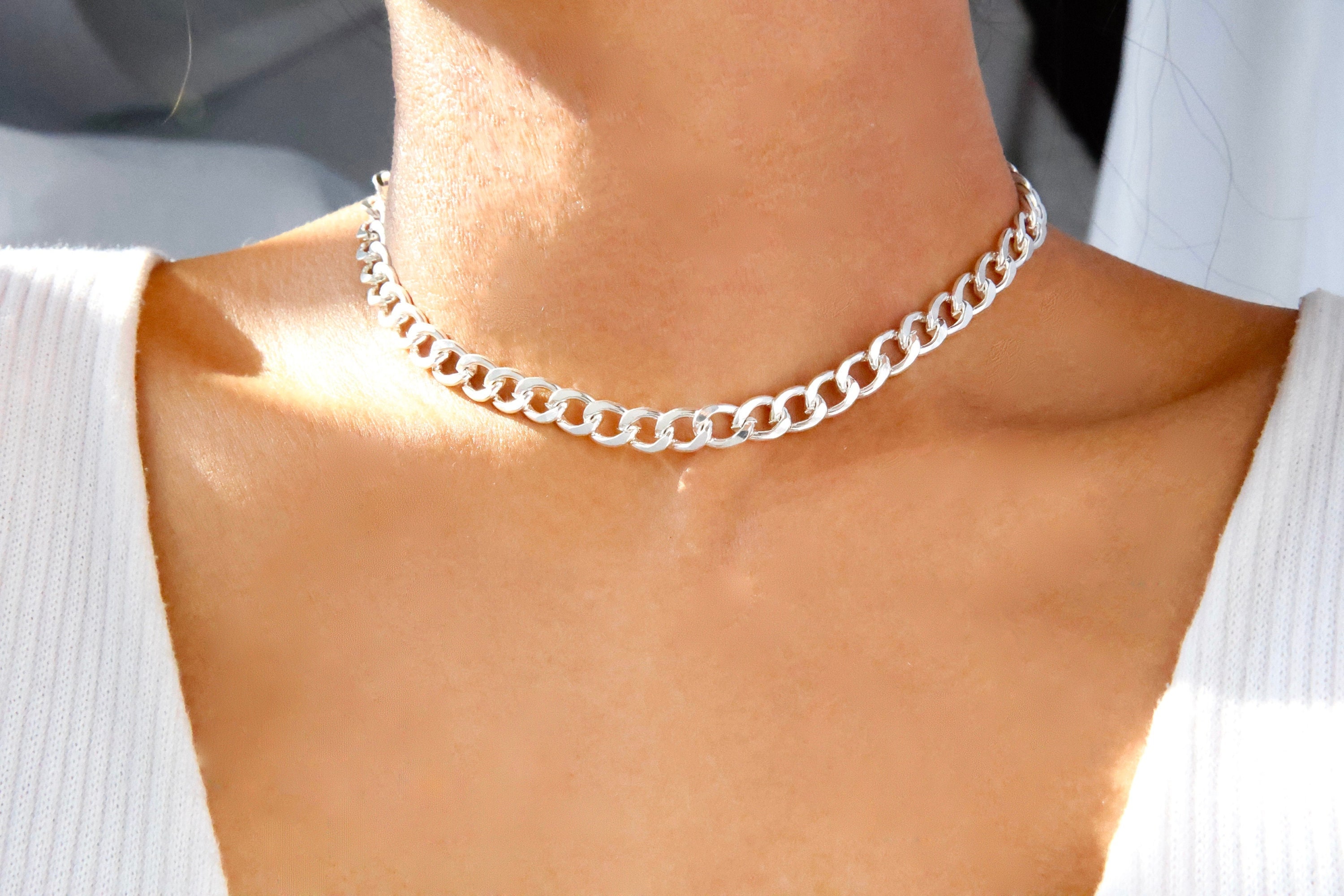 silver curb chain choker necklace / simple silver curb chain / chun...
