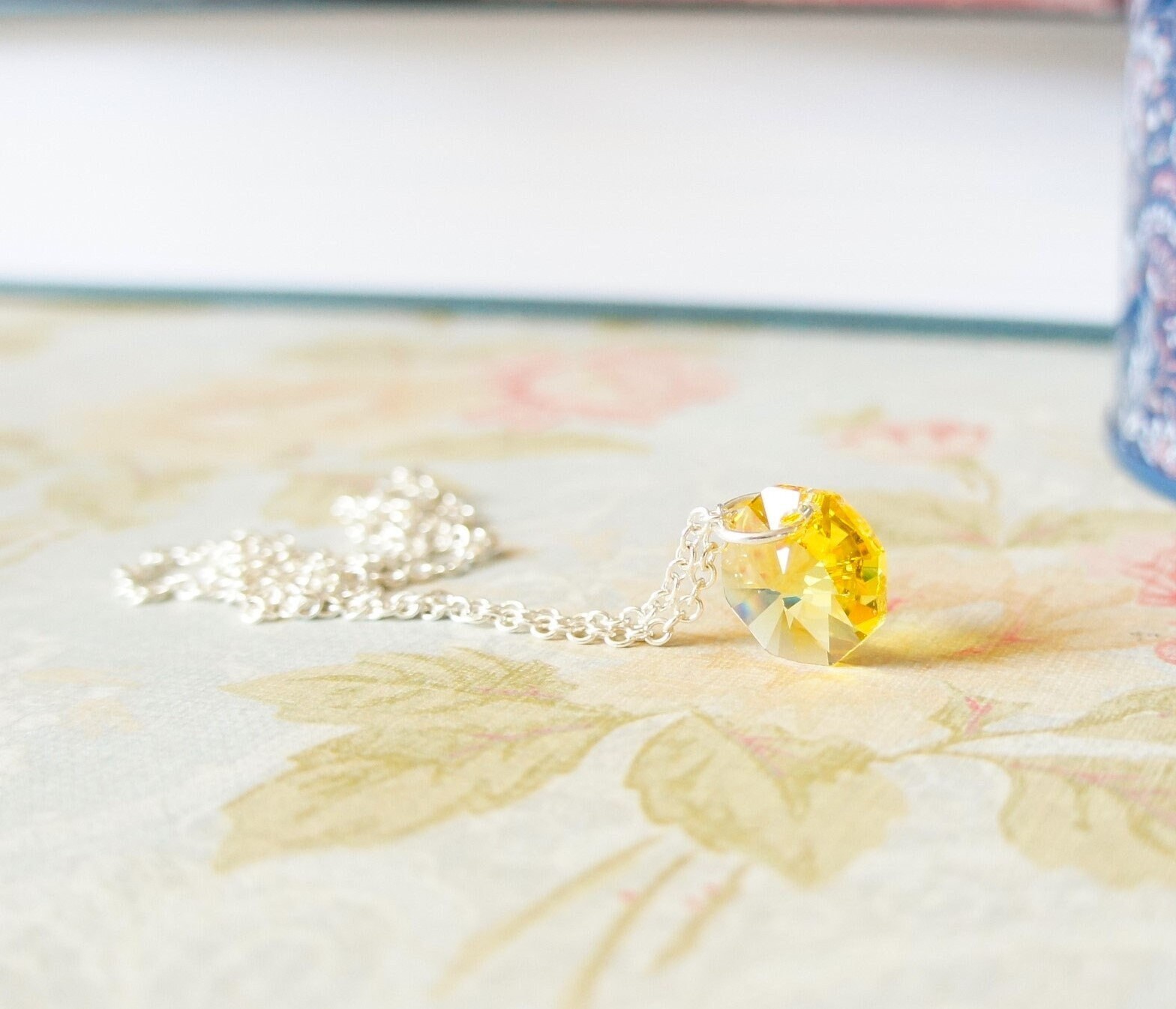 Cute necklace handmade with Swarovski yellow crystal octagon bead and chain. The pendant is 15mm (ap...