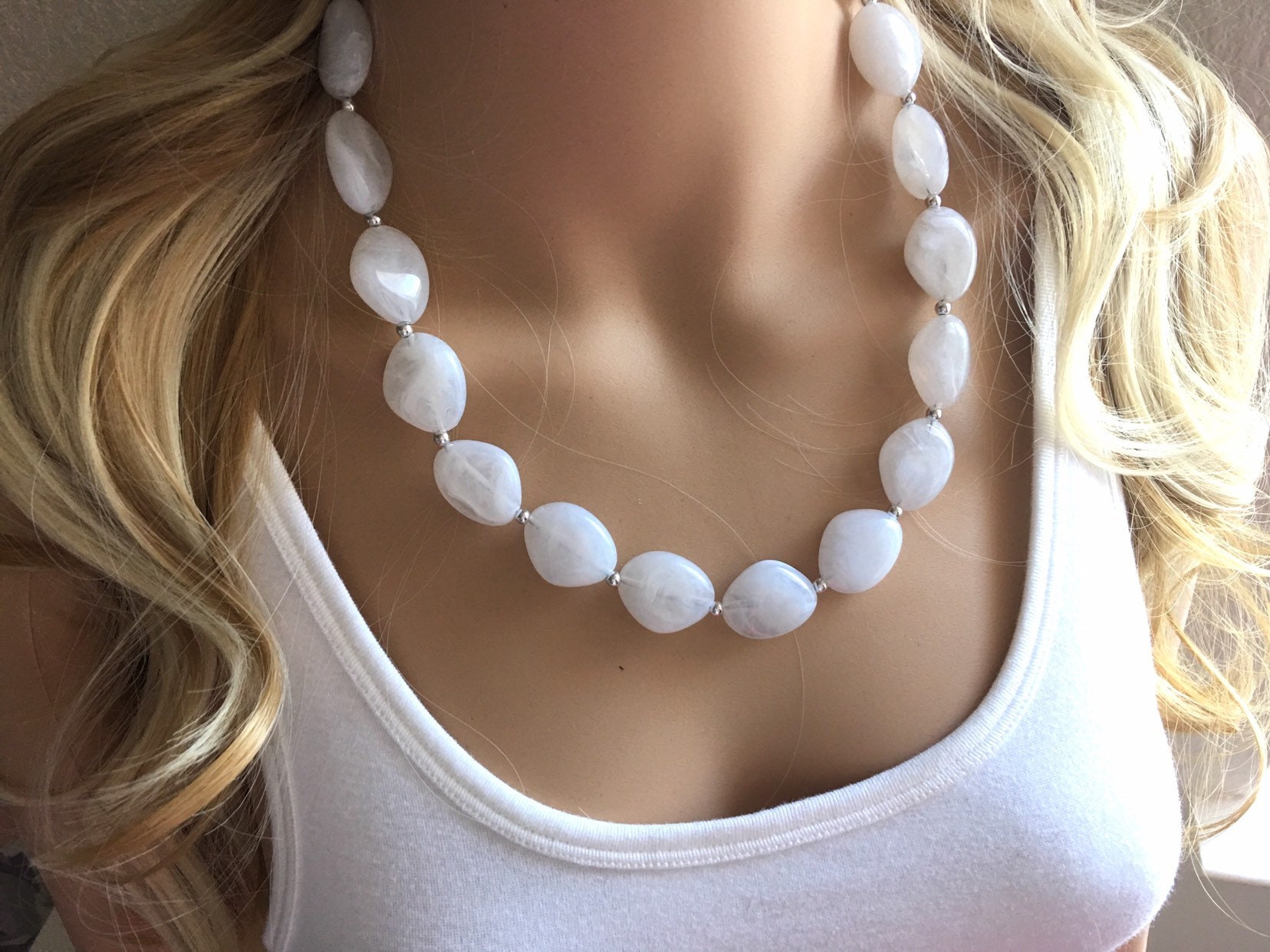 White chunky statement necklace, bib jewelry cloudy white necklace,...