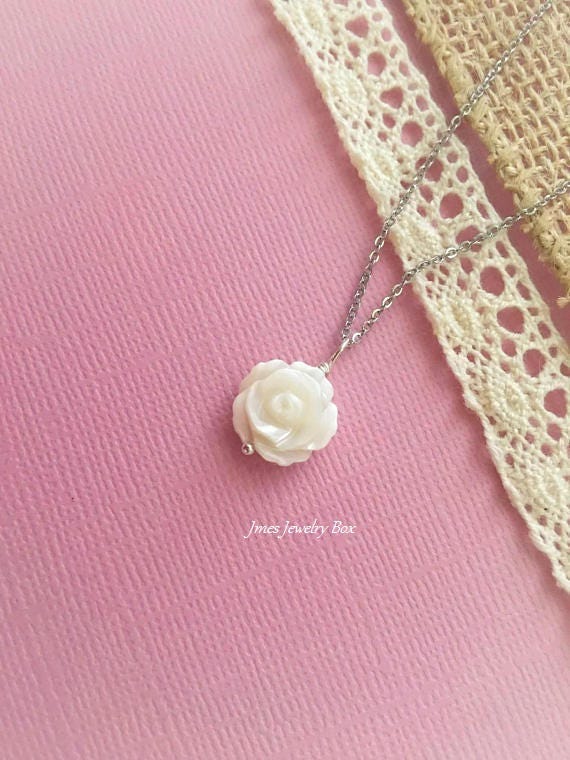 White shell rose necklace, White rose necklace, White flower neckla...