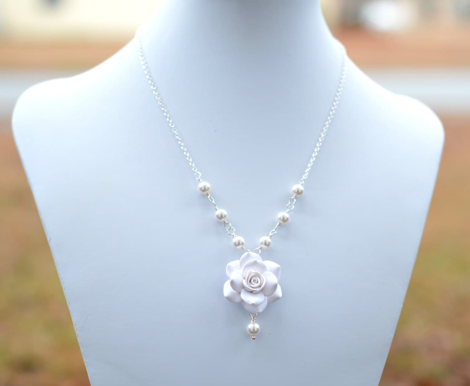 "Featuring Hand sculpted White Rose Necklace. The entire length of the necklace is approximatel...