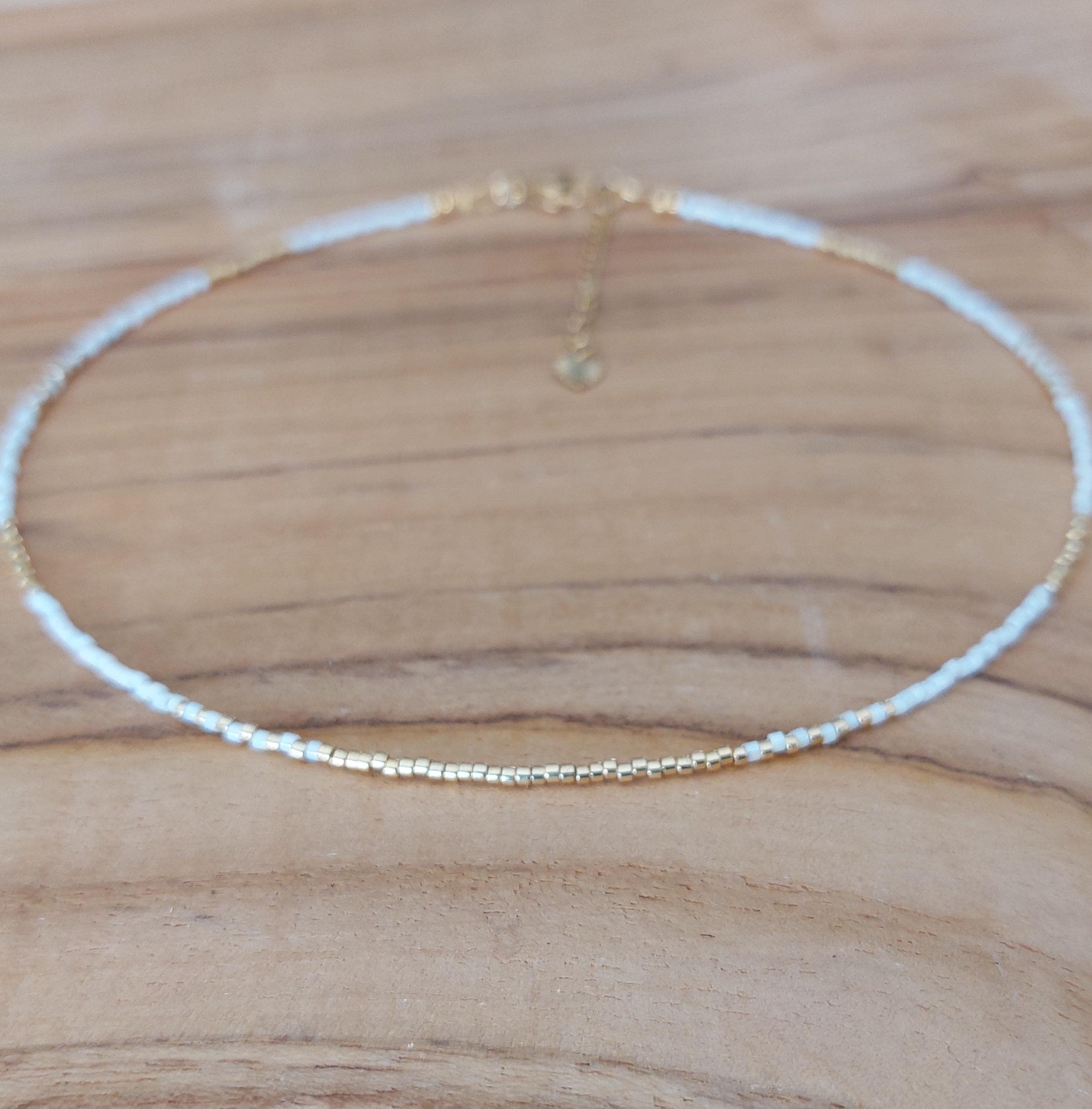 Very fine delicate bead necklace with small white/pearl and gold-colored glass beads. For the neckla...