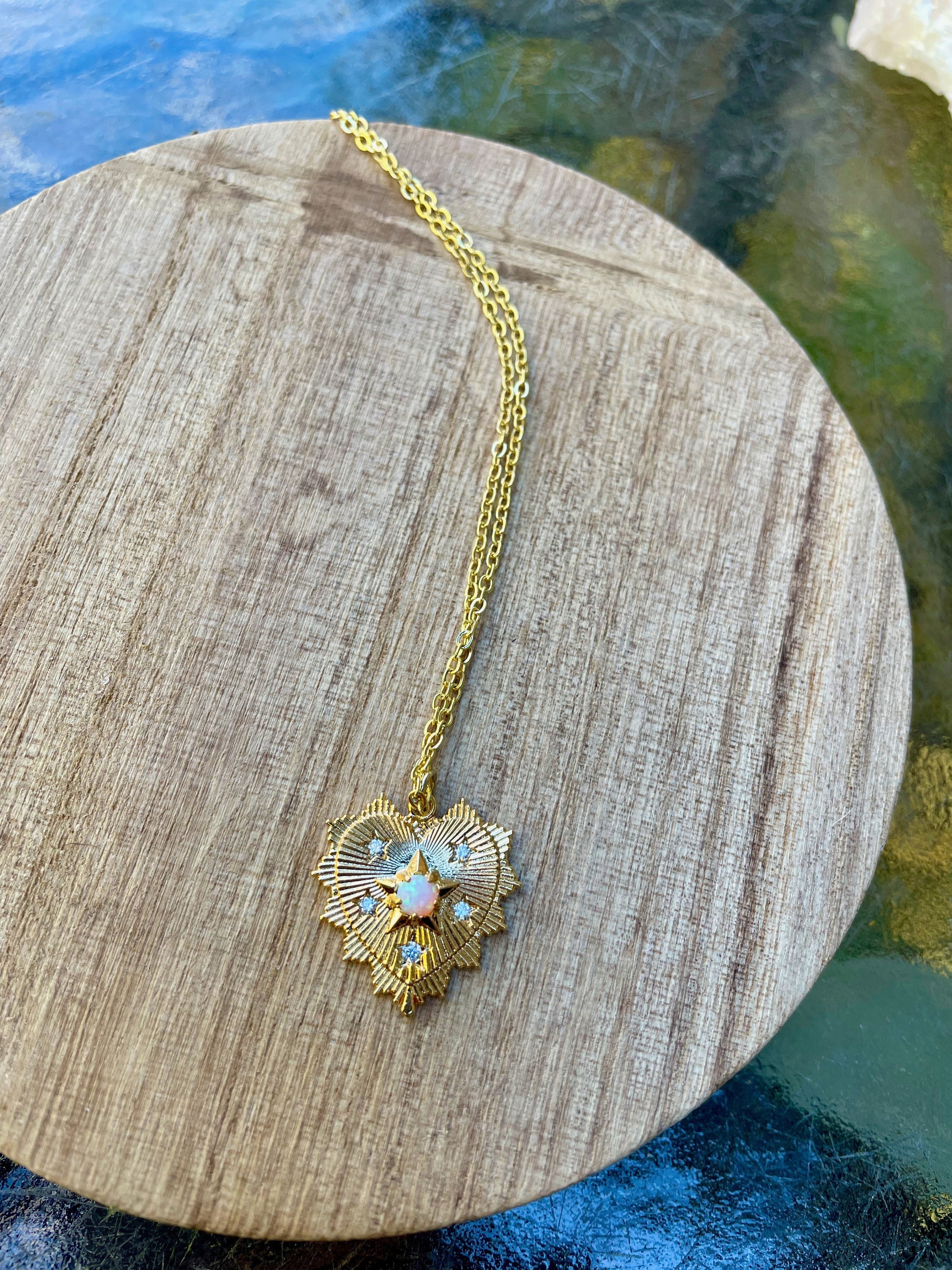 opal gold heart necklace, gold jewelry, gold heart necklace, opal n...