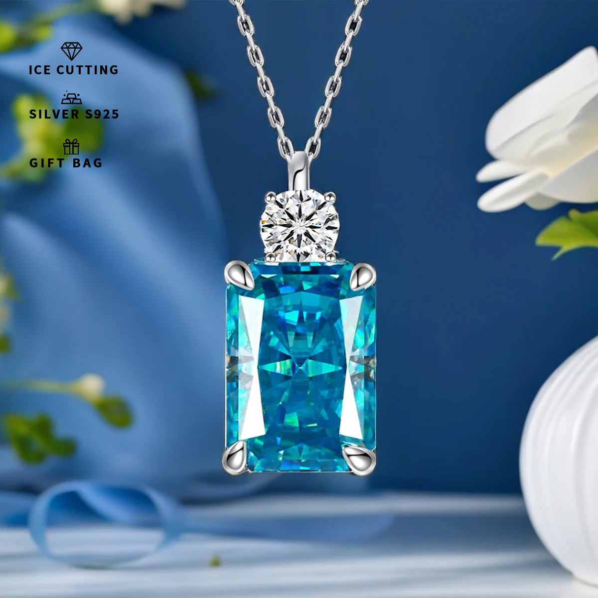 S925 sterling silver Rectangular Ice Cut zircon High-carbon diamond topaz blue necklace,pendant neck...