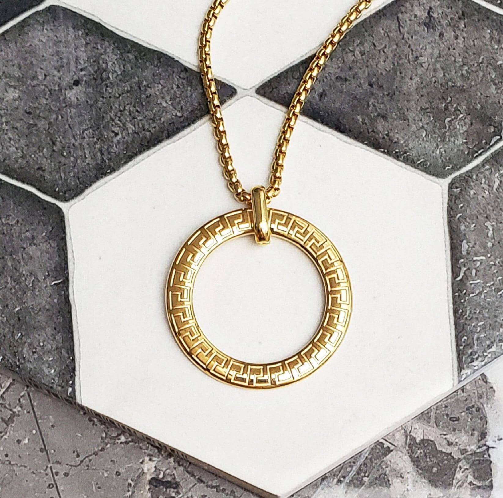 Men's GREEK KEY RING Necklace | Men's Gold Stainless Steel Greek Ke...