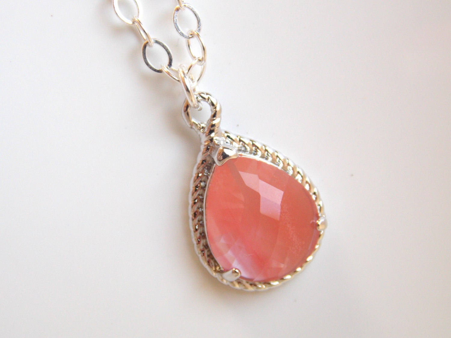 Stunning glass sterling silver necklace in coral color! This beautiful glass faceted pendant is susp...