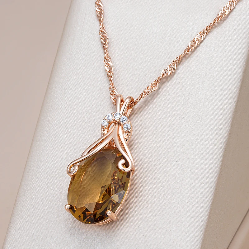 Kinel Hot Big Oval Light Brown Natural Zircon Pendant Necklace for Women Fashion 585 Rose Gold Color...