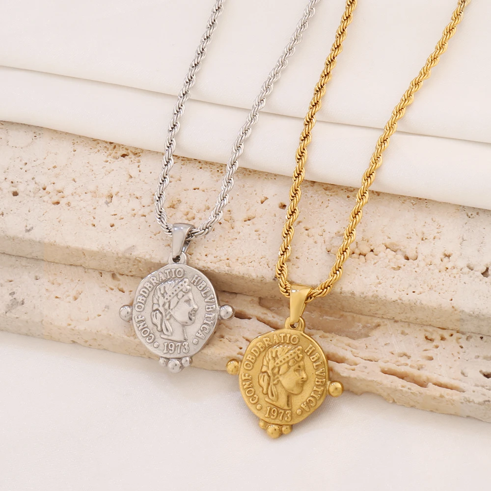 316L Stainless Steel Portrait Queen Coin Necklace Vintage Relief Coin Pendant Chain Necklaces Waterp...