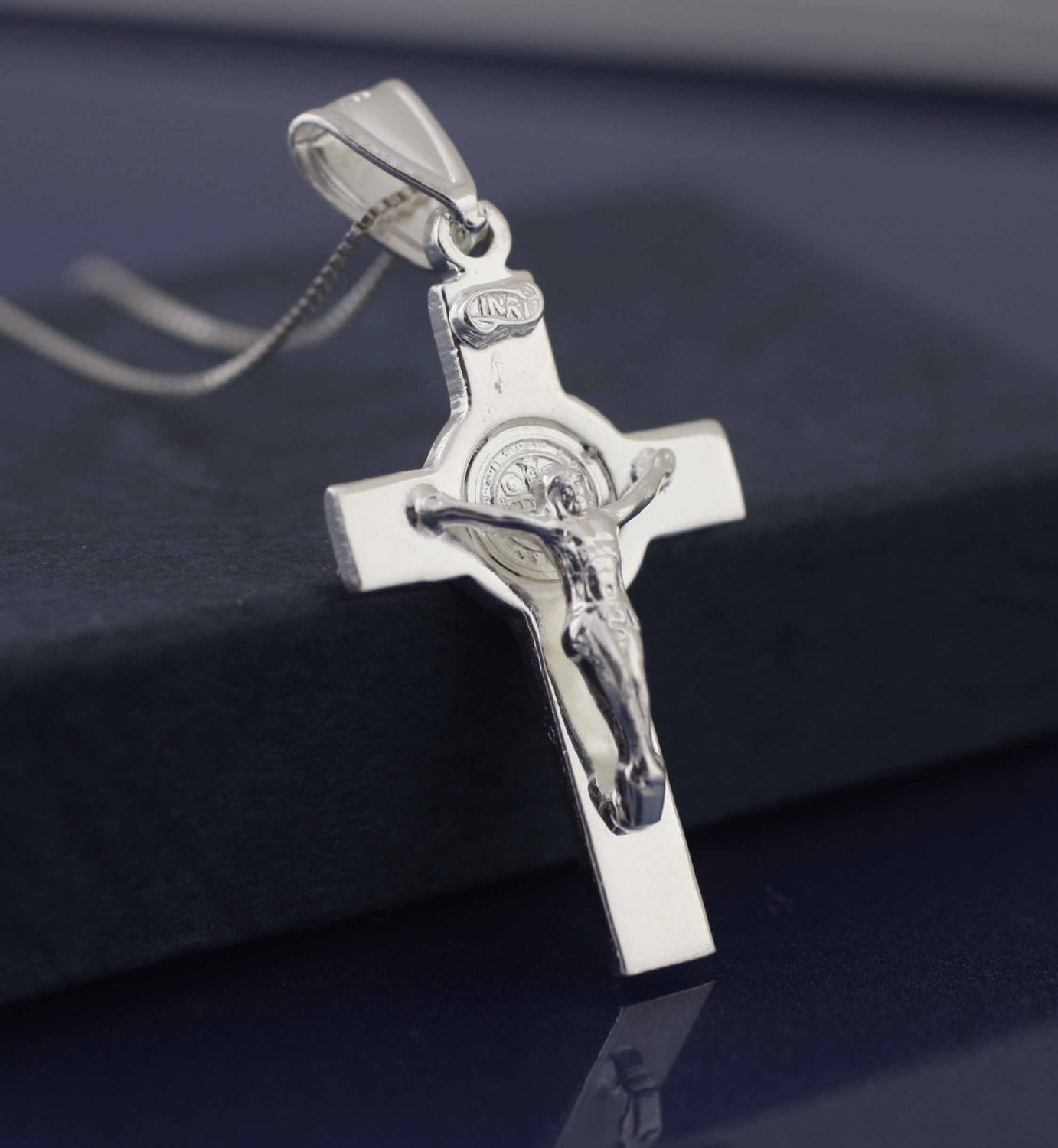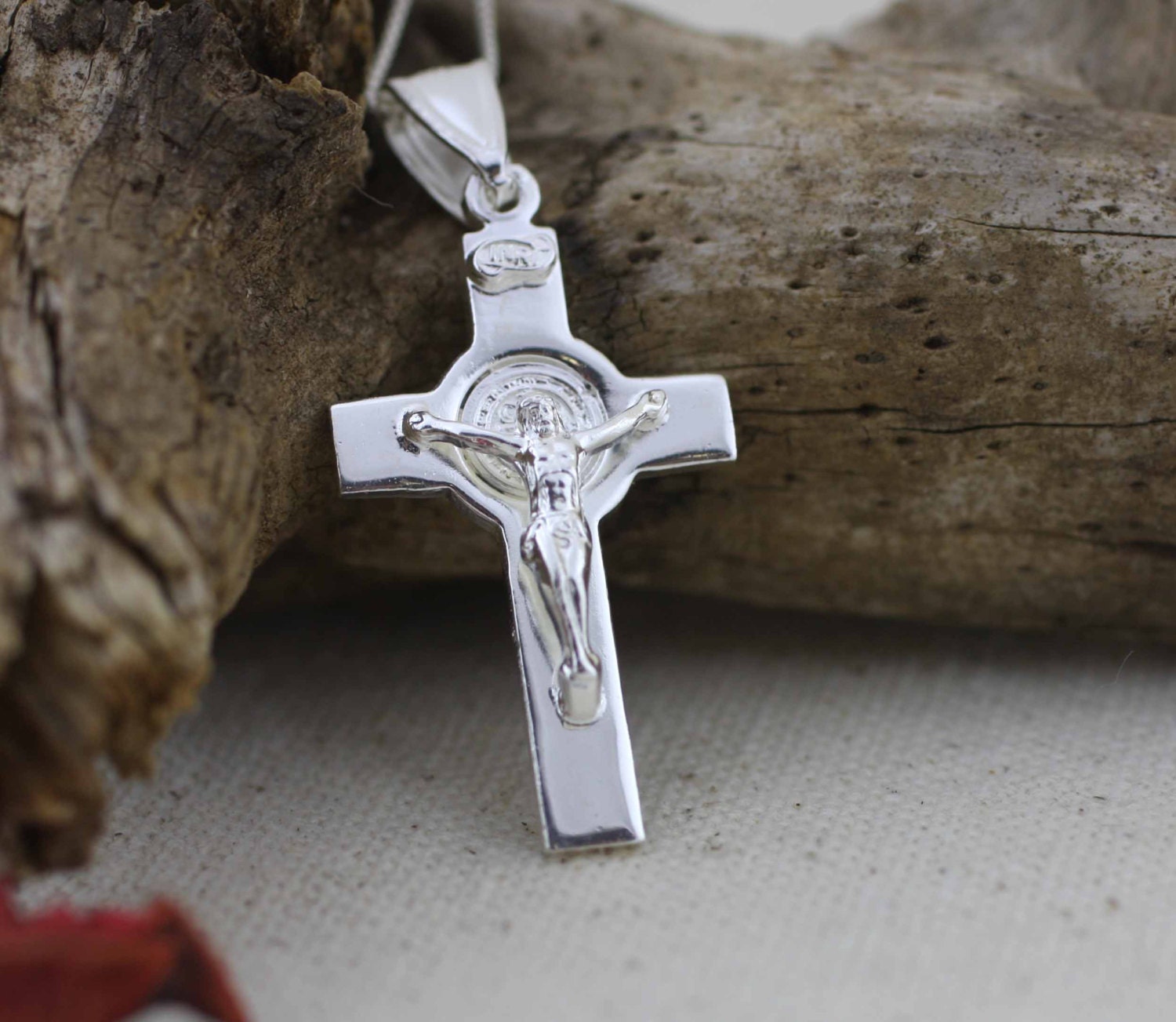 Silver St Benedict Crucifix, St Benedict Solid Cross Necklace. Sain...