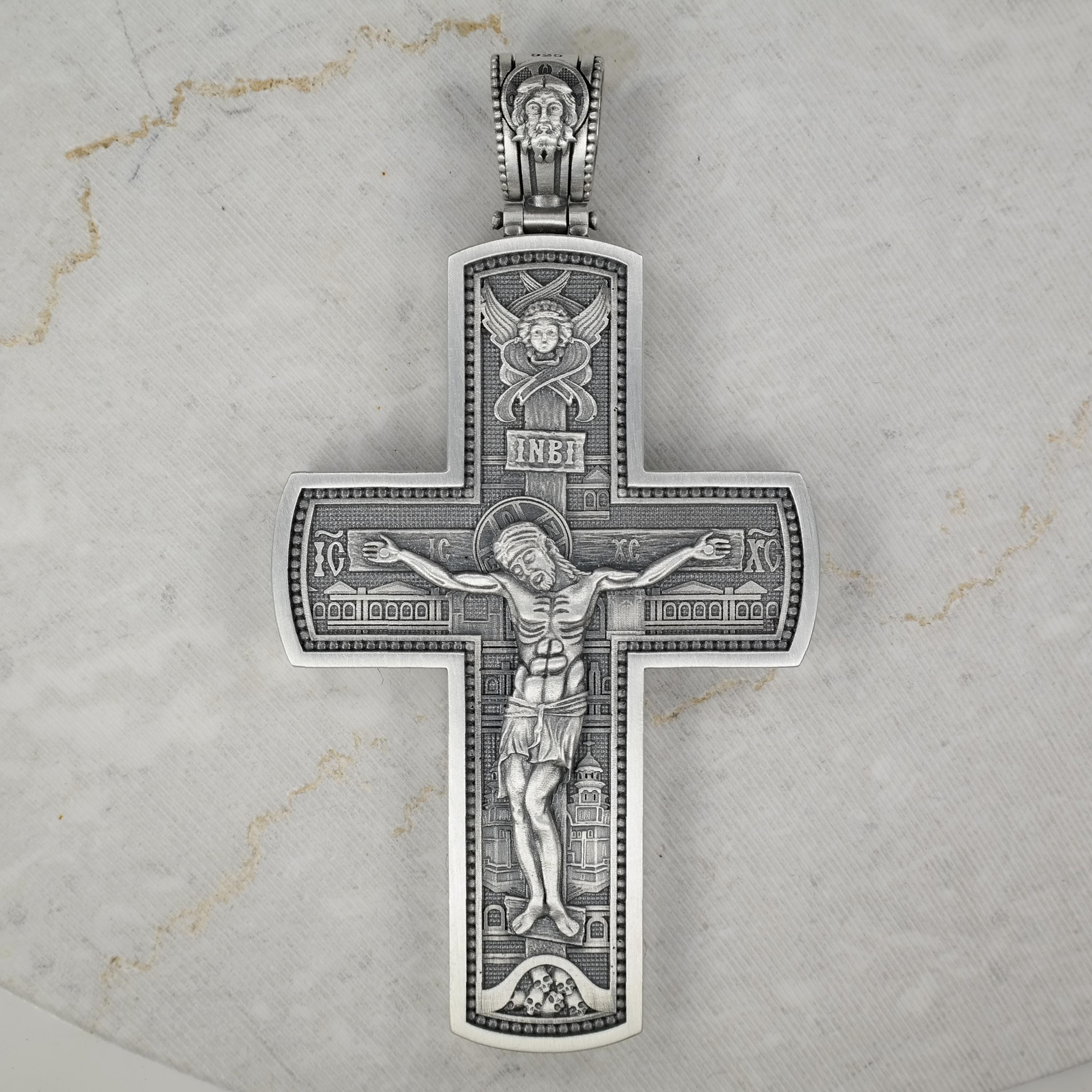 Silver Orthodox Cross with Gold Plating, Christ Pantocrator, Holy Trinity, St. Nicholas the Wonderwo...