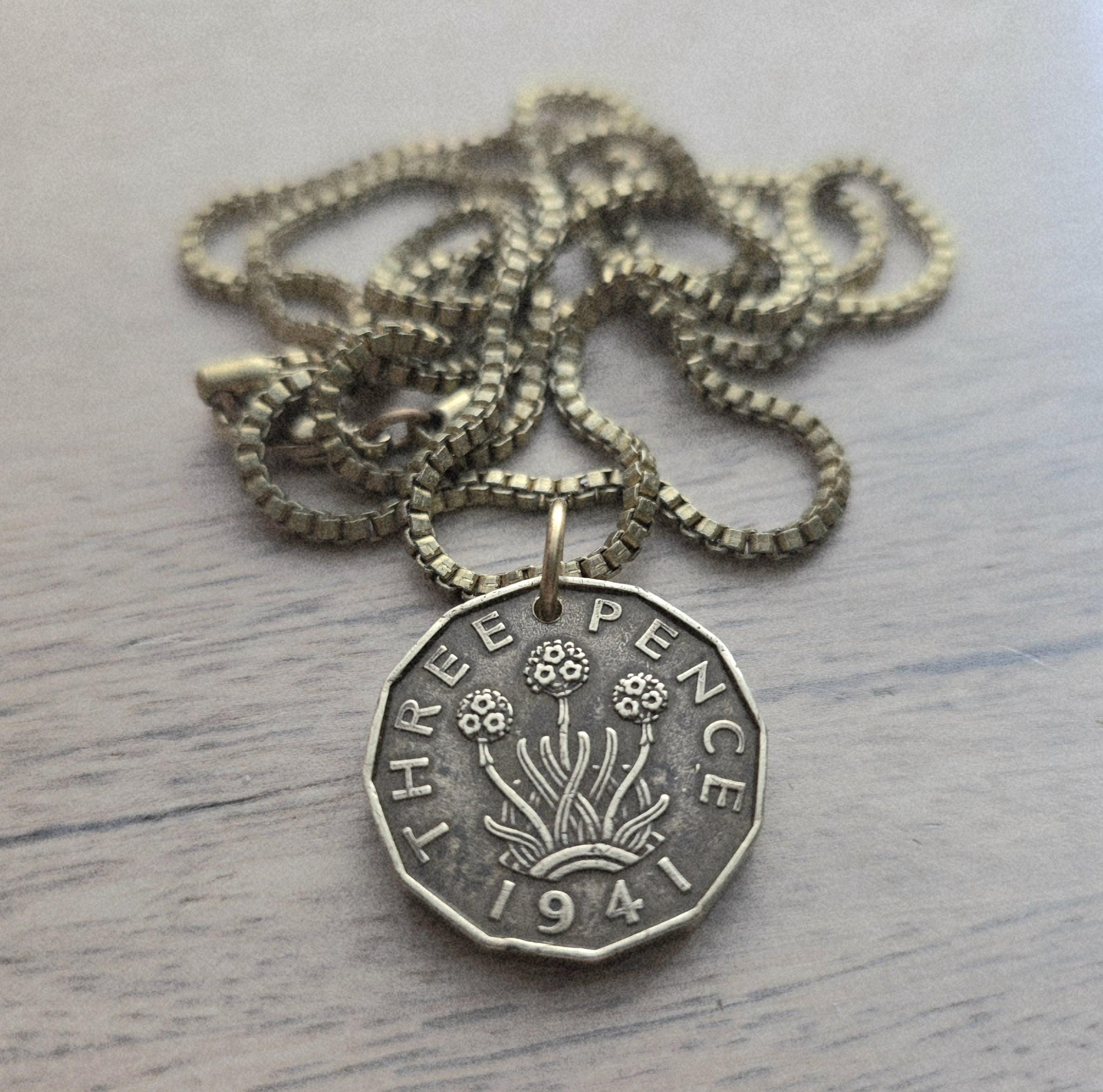 1941 Three Pence Coin Necklace, England Great Britain Flower Coin, ...