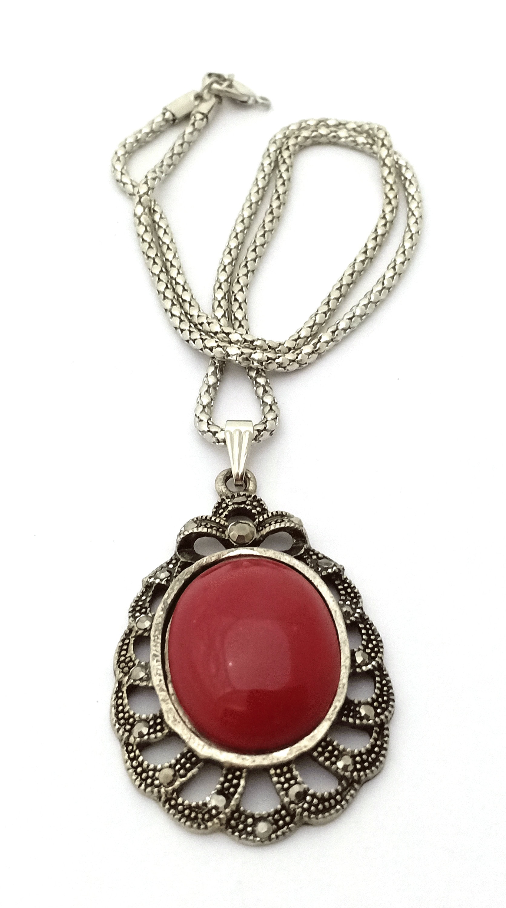 Red Coral Pendant / Oval Shape Red Coral Necklace / Handmade Red Co...