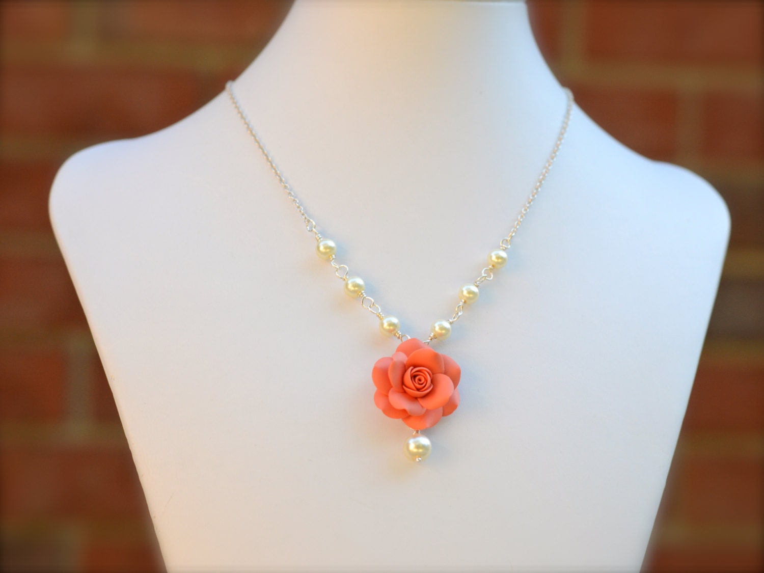 "Featuring Coral Orange Rose and Off-White Pearl Drop Necklace. * Hand Sculpted Rose . Size app...