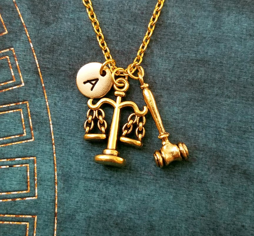 This listing is for a scales and gavel pendant necklace with your choice of hand stamped initial cha...