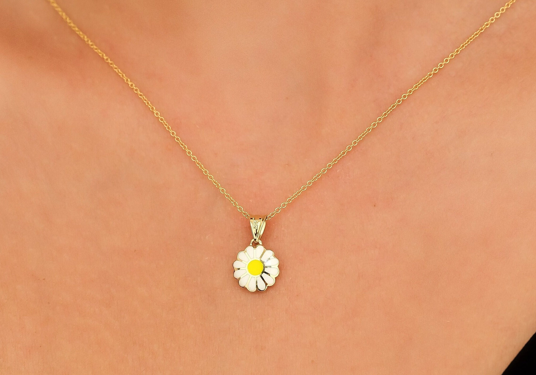 14K Yellow Gold Daisy Flower Necklace, Enamel Daisy Flower Necklace...