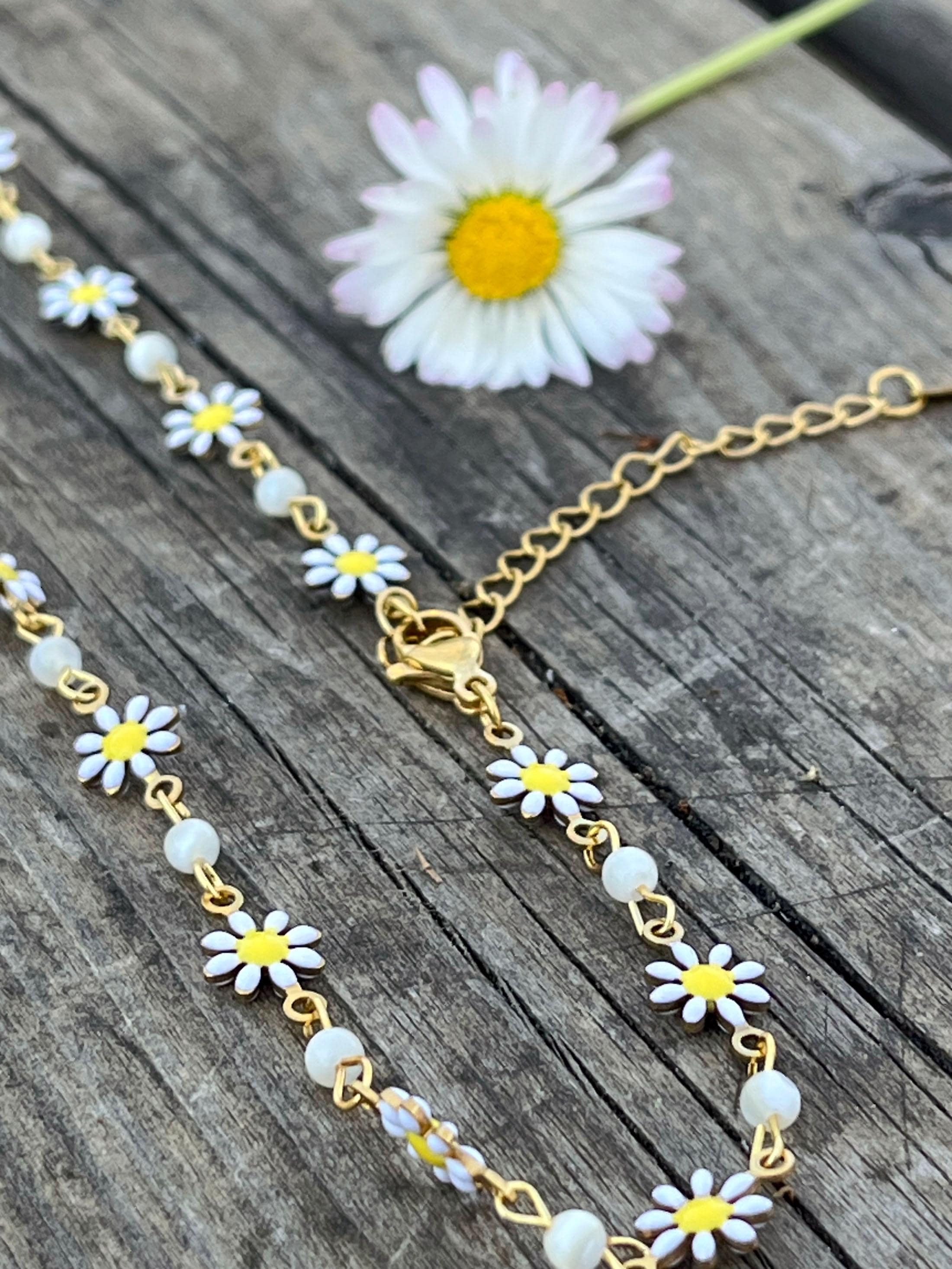 "For flower lovers, we offer a daisy necklace or a daisy bracelet. Choose both if you can't dec...