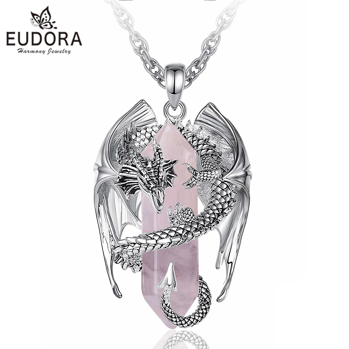 Eudora Dragon Twining Hexagonal Rose Quartz Prismatic Necklace Punk Healing Stone Rose Quartz Pendan...