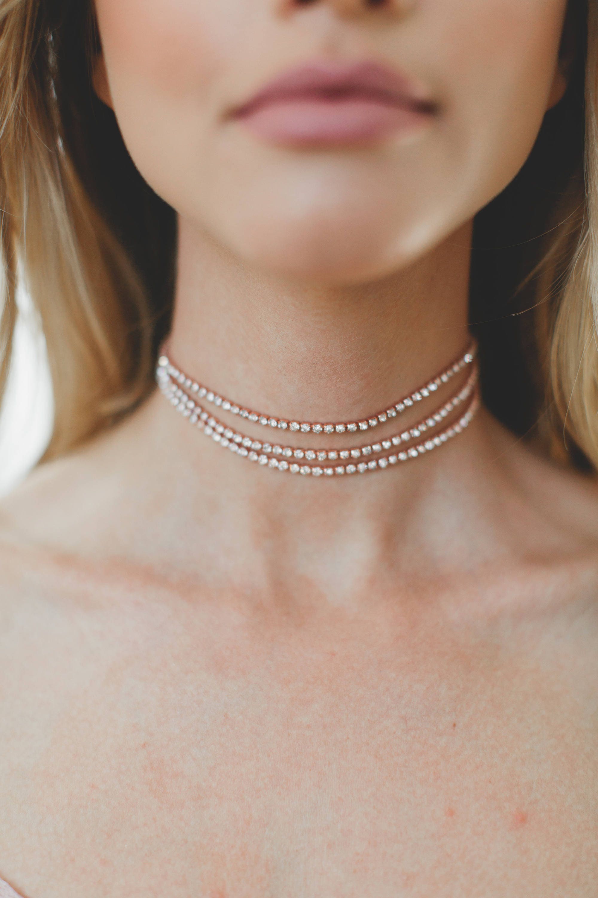 "A touch of sparkle makes this dainty choker COMPLETE! Three rhinestone strands fall at differe...