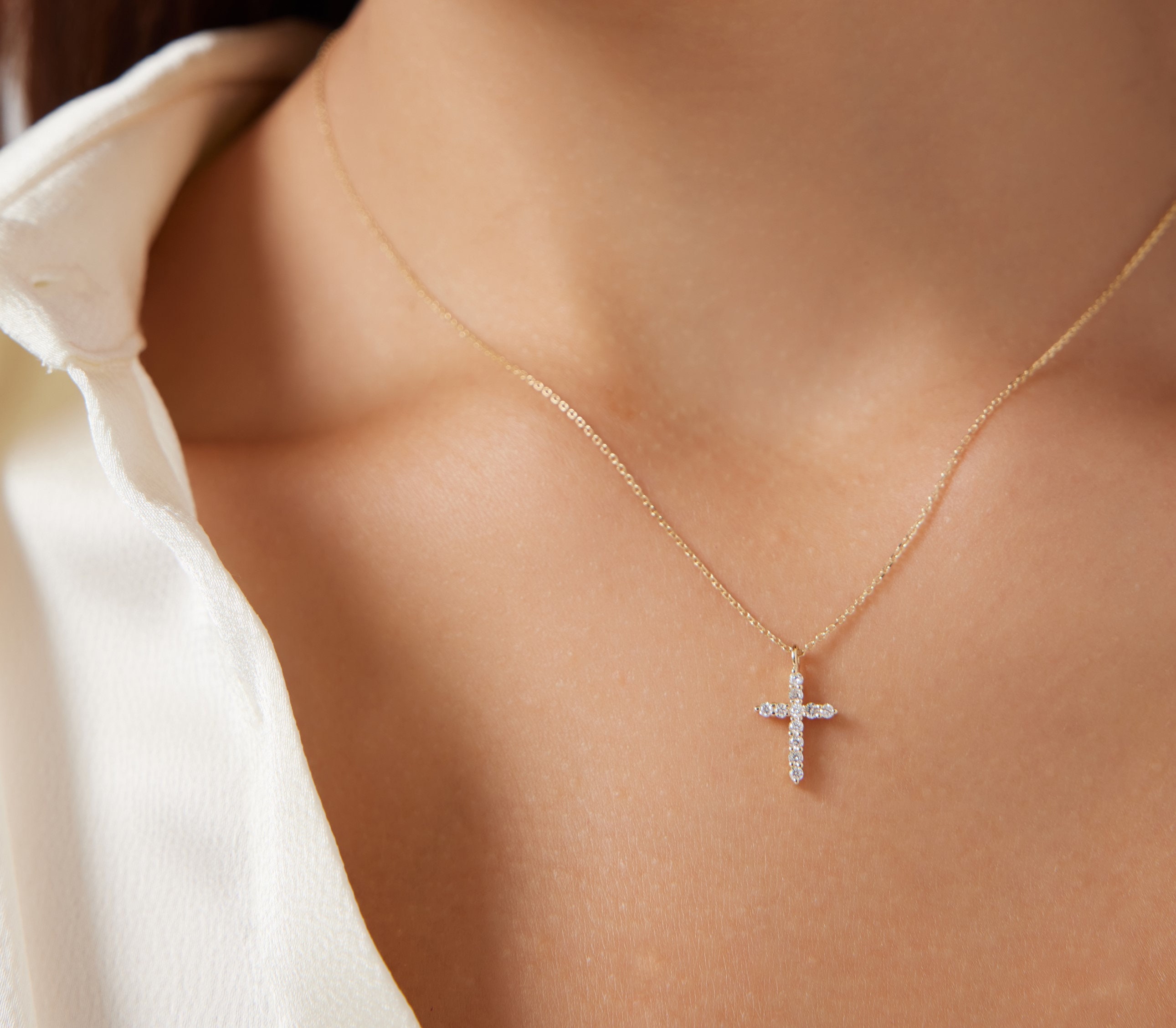 Diamond Cross Necklace, Minimalist Diamond Cross Necklace, Cross Je...
