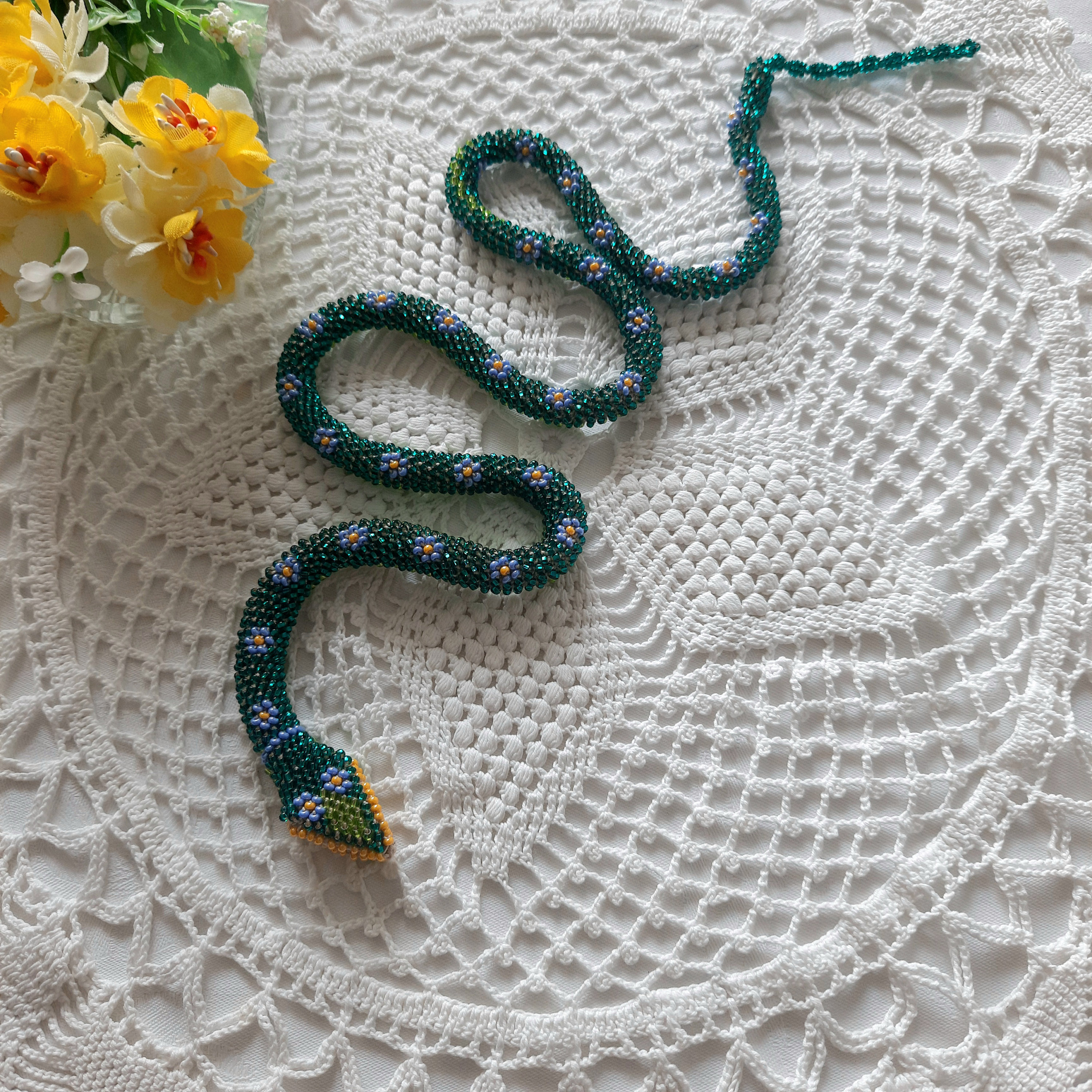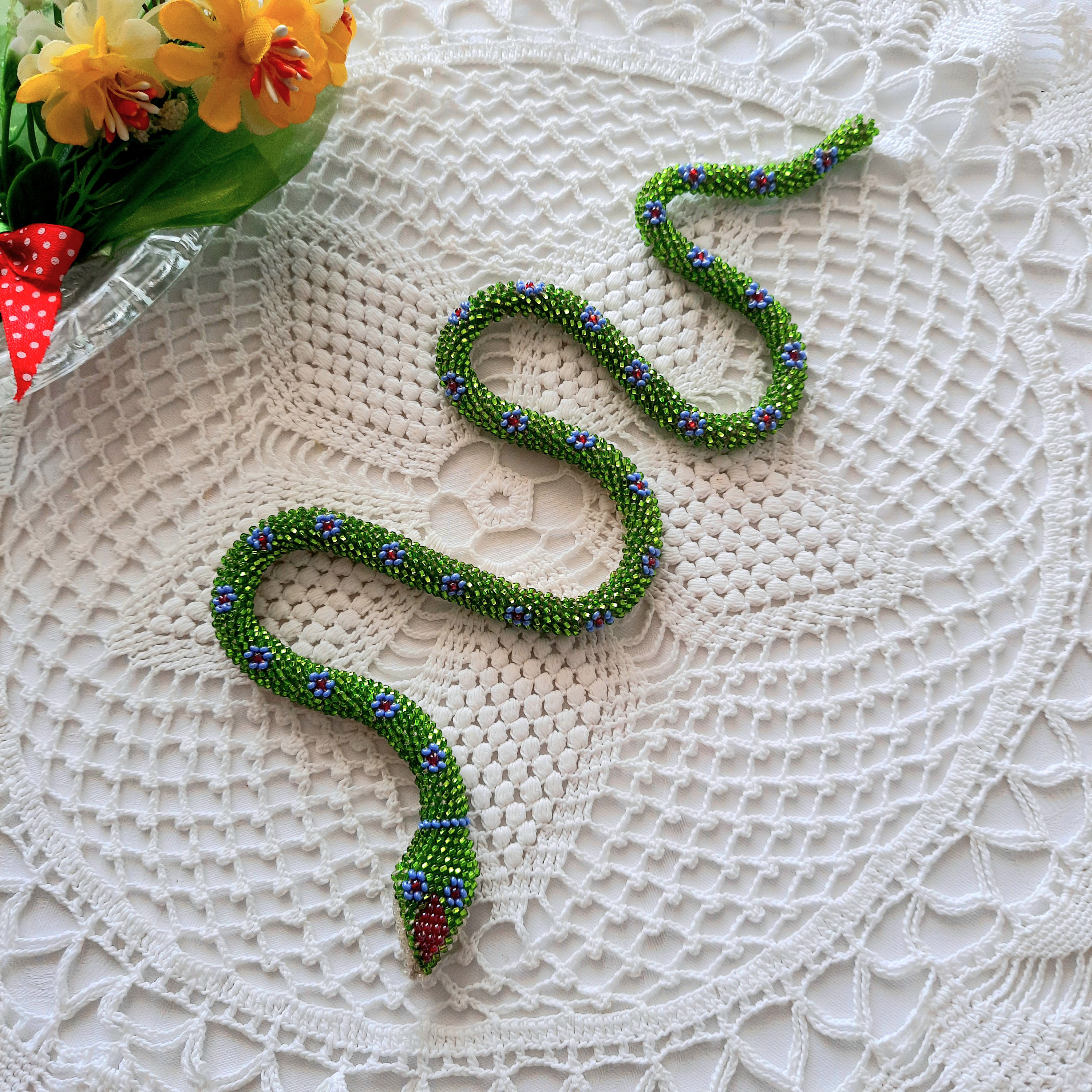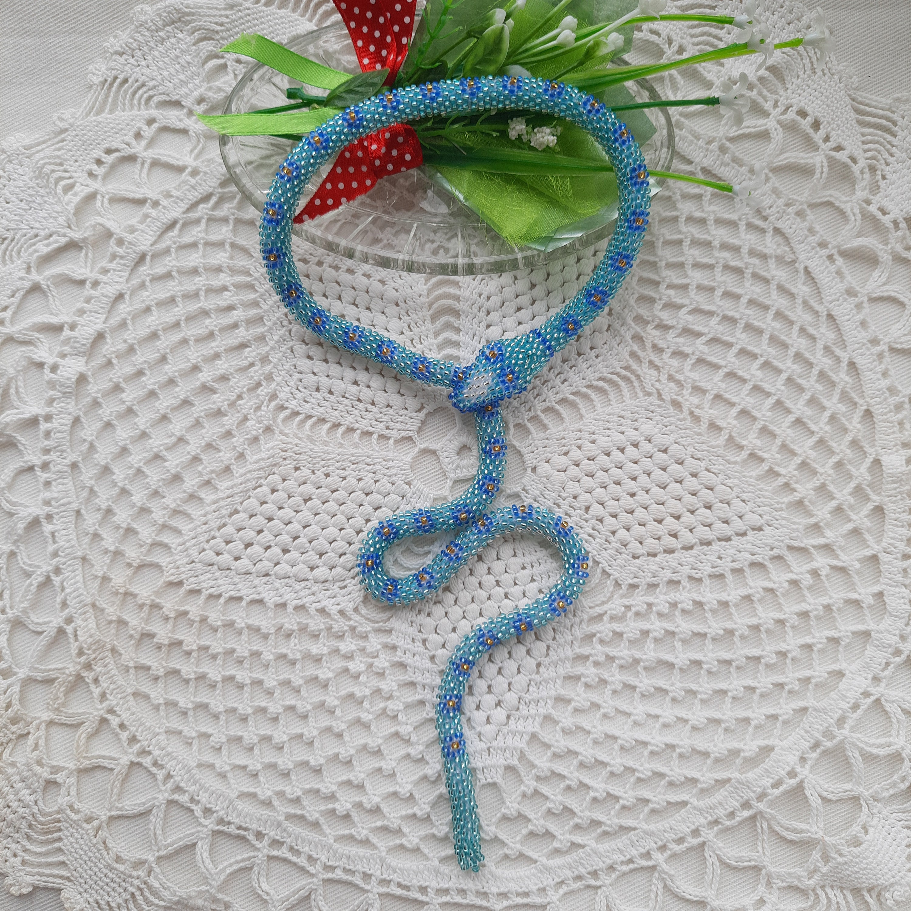 "The necklace is made of Czech beads, the necklace is crocheted, 100% handmade. Jewelry snakes....
