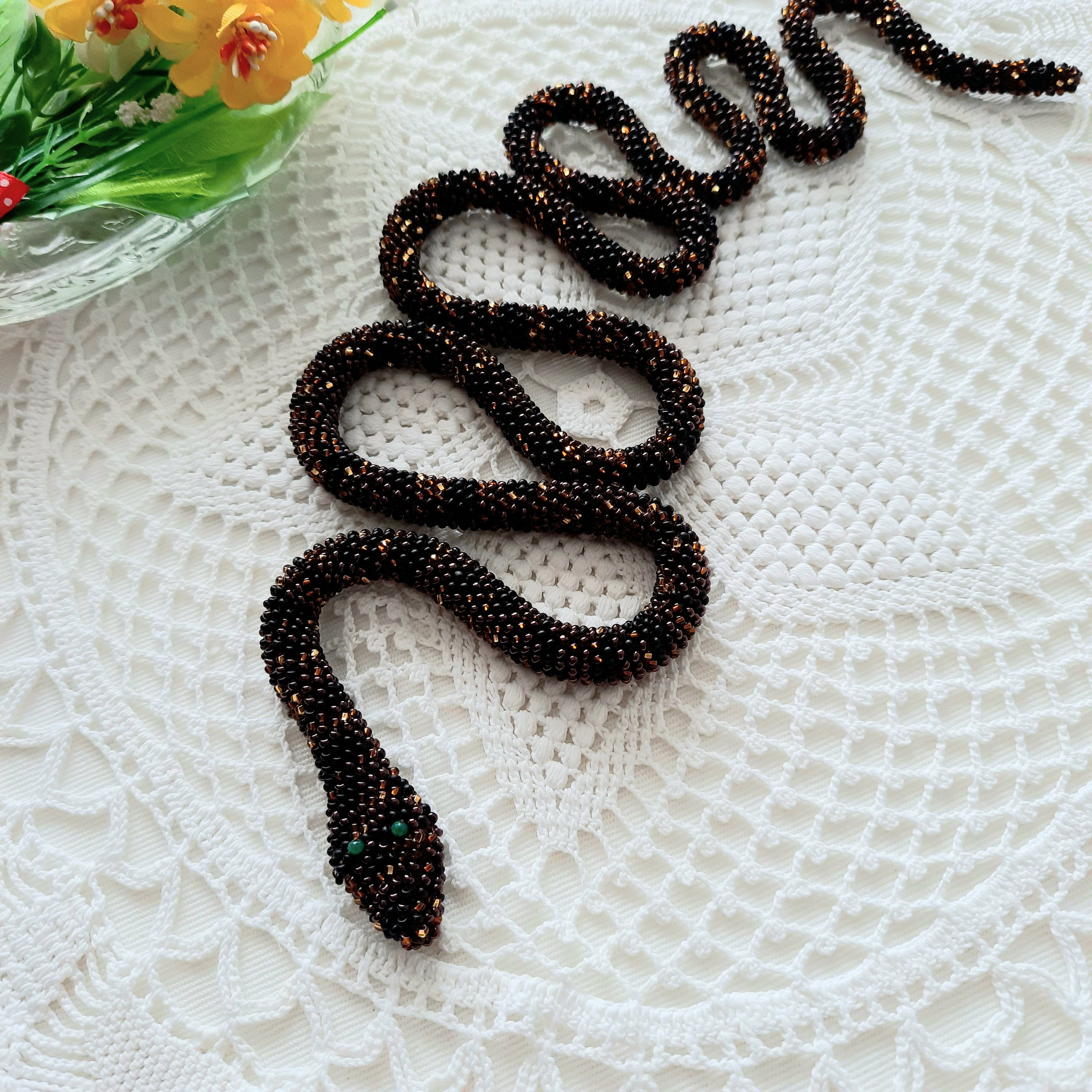 Snake Necklace Crochet Brown Snake Jewelry Beaded Snake Black Pytho...