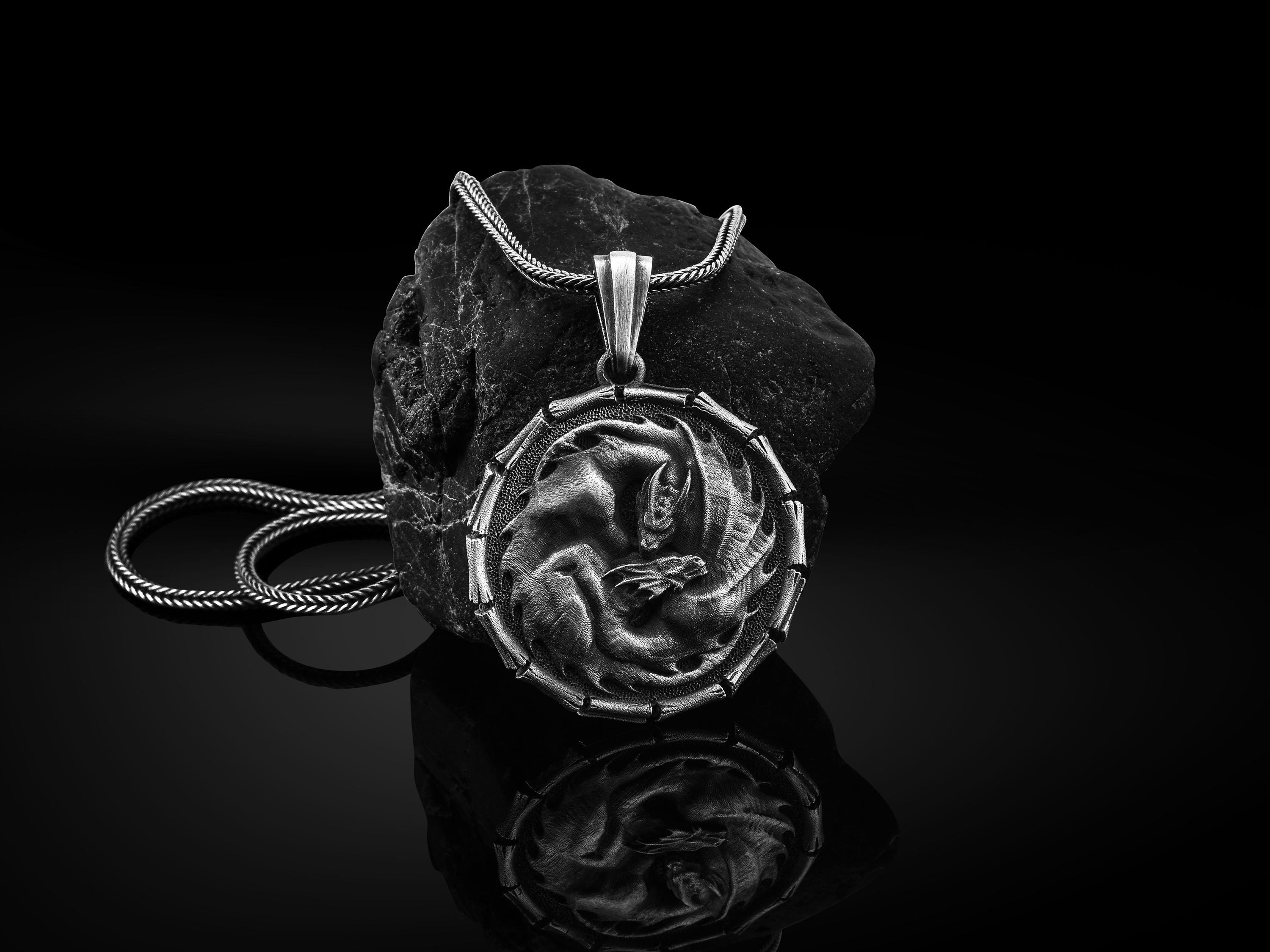 Round Dragon Necklace, Silver Men Dragon Pendant, Mythical Fantasy ...