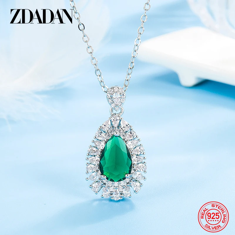 ZDADAN 925 Sterling Silver Water Drop Emerald Necklace Chains For Women Fashion Jewelry