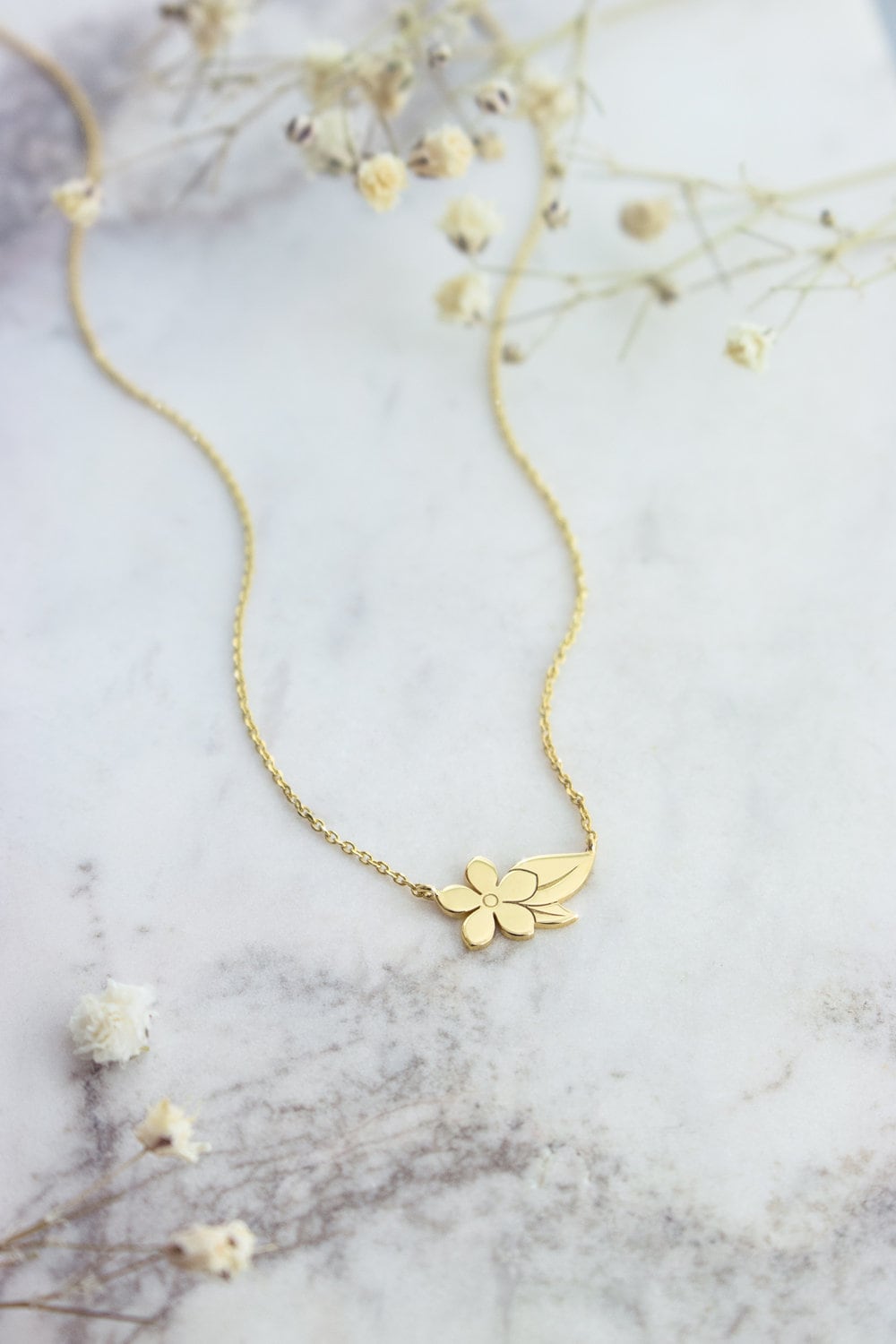 Gold Flower Leaf Necklace, Engraved Gold Charm, 9K 14K 18K Gold Nec...