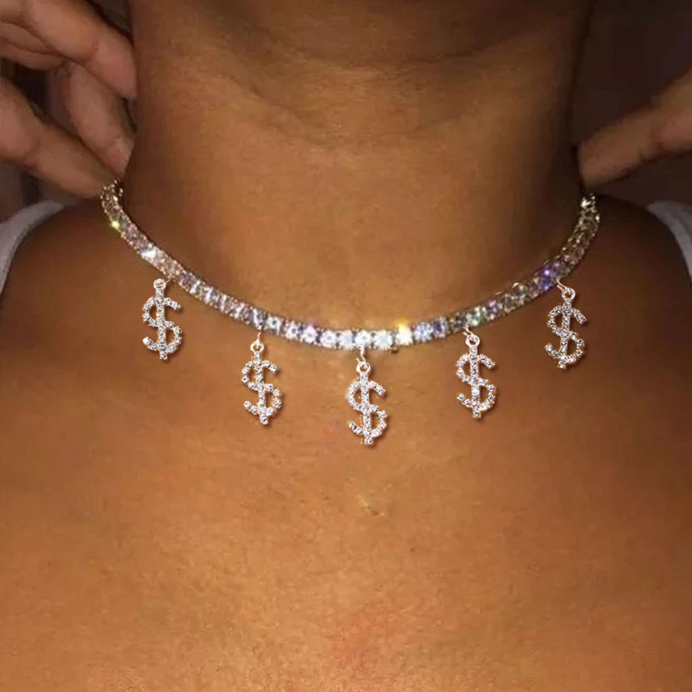 Bling Rhinestone Dollar Sign Pendant Choker Necklace for Women Gold Silver Color Crystal Chain Neckl...